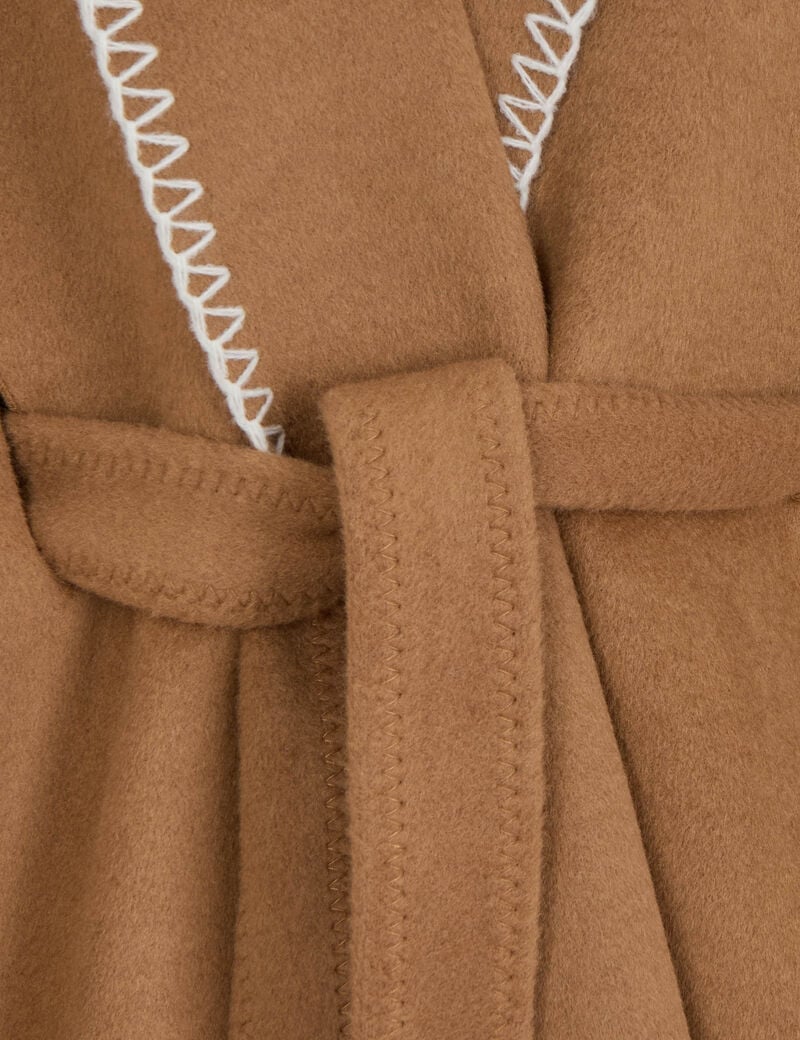 Capa, com cinto, corte solto, colarinho lapela e assimétrico. Detalhe em contraste na beira. Tamanho único.