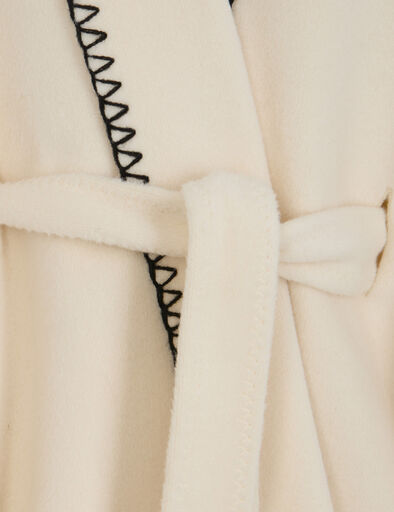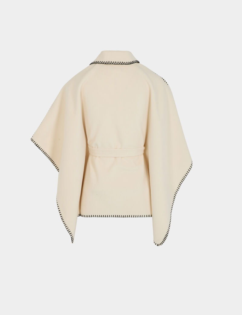 Capa, com cinto, corte solto, colarinho lapela e assimétrico. Detalhe em contraste na beira. Tamanho único.