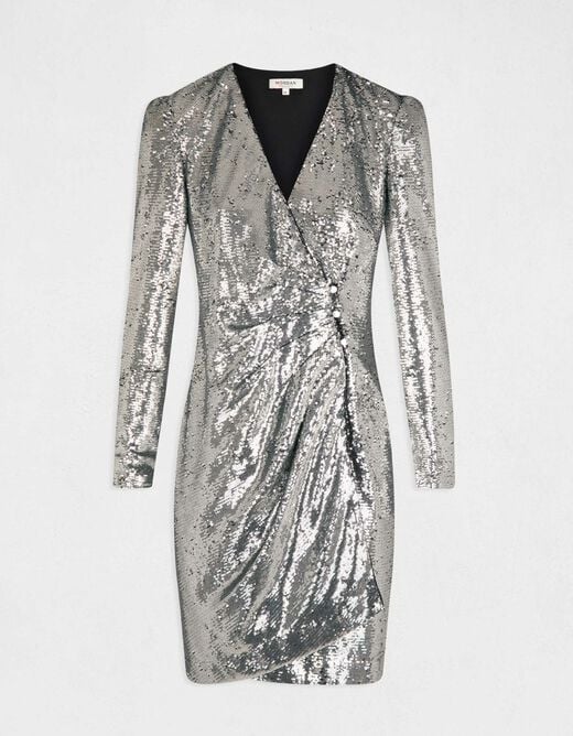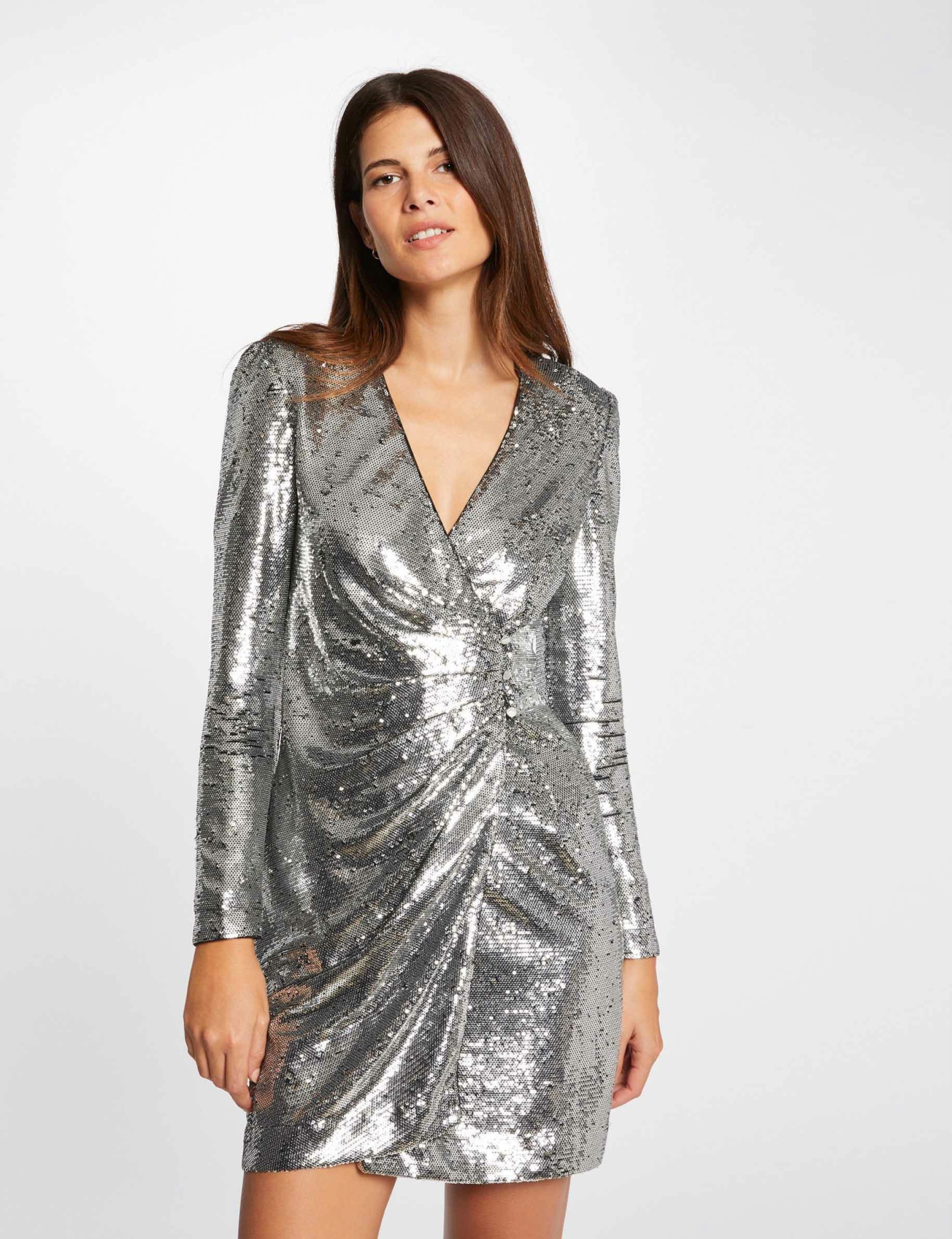 Vestido curto, com mangas compridas e corte envelope, todo em lantejoulas prateadas. Botões decorativos na lateral da cintura.