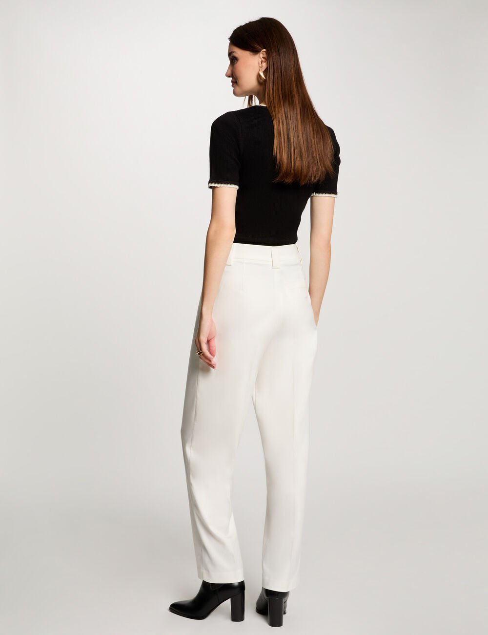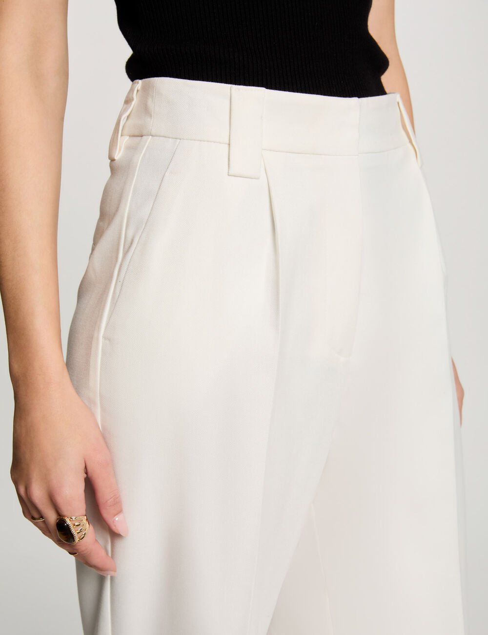 Calça wide leg, com pinças, cintura subida e dois bolsos italianos. Presilhas no mesmo tecido.