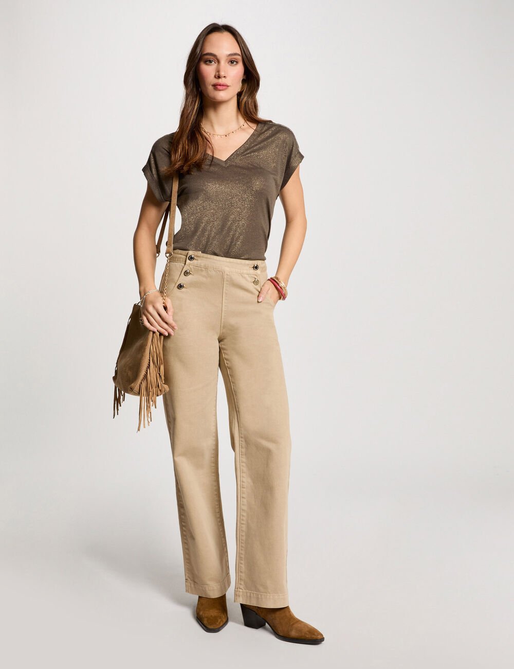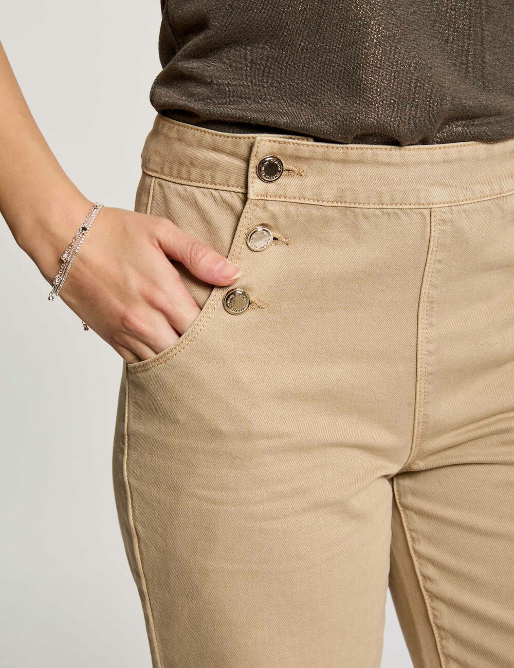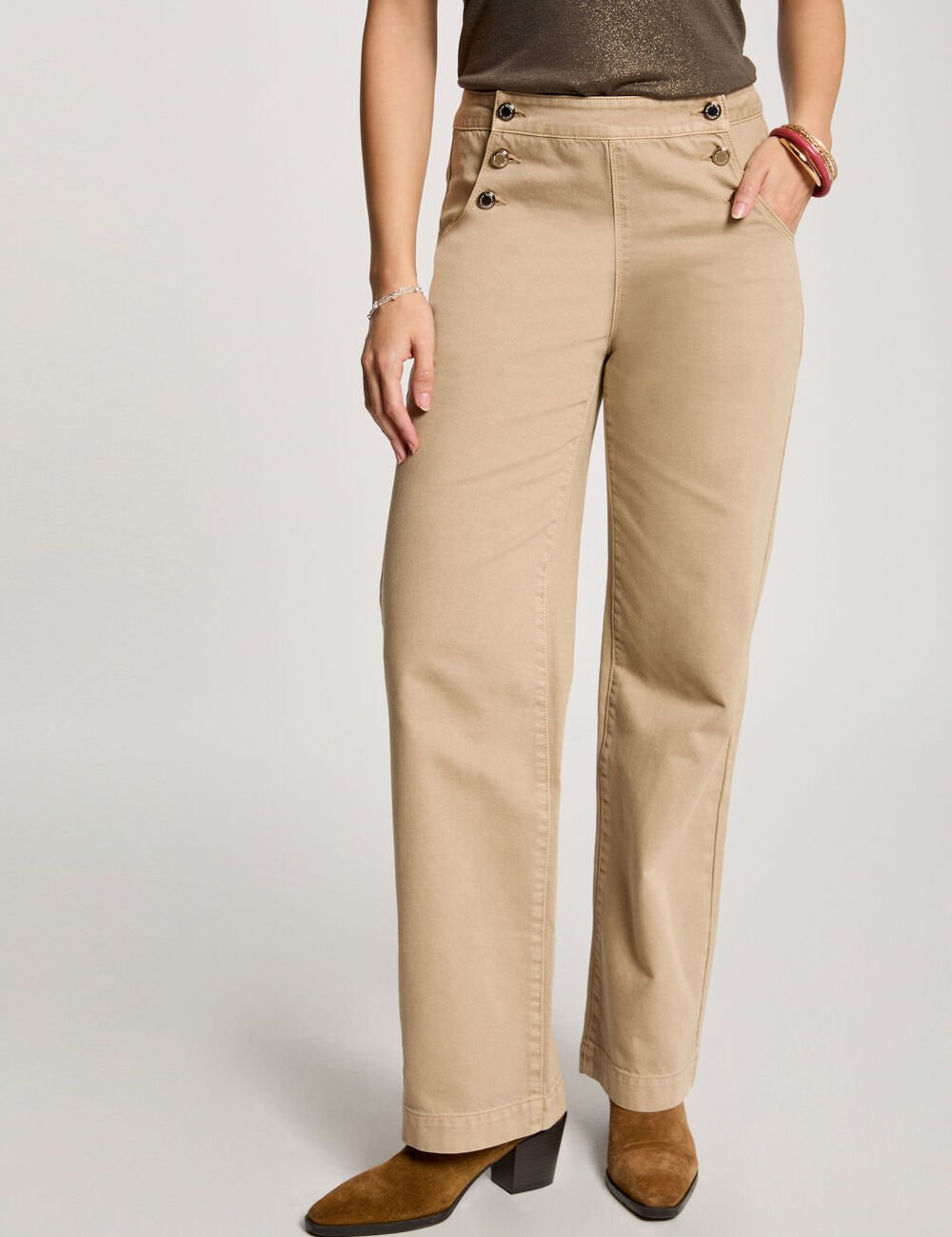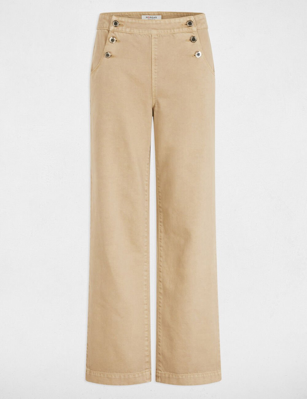 Calças estilo wide leg com botões decorativos. Cintura baixa. Dois bolsos italianos e dois bolsos traseiros.