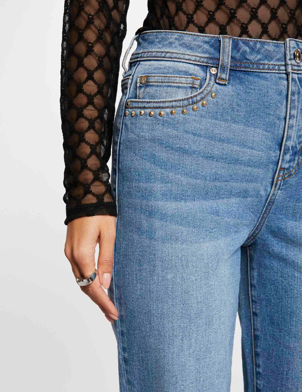 Jeans com corte direito e cintura subida, de cinco bolsos.