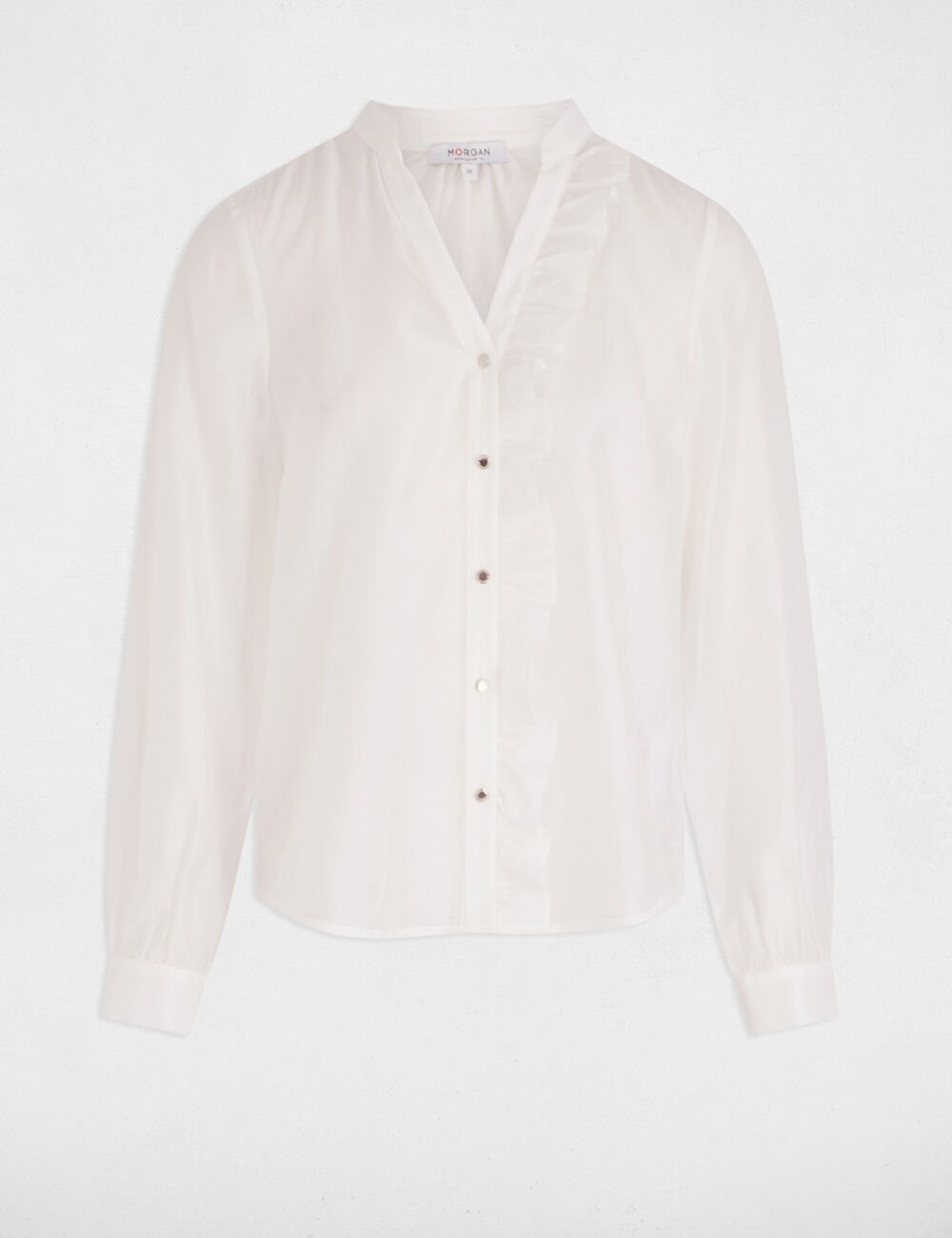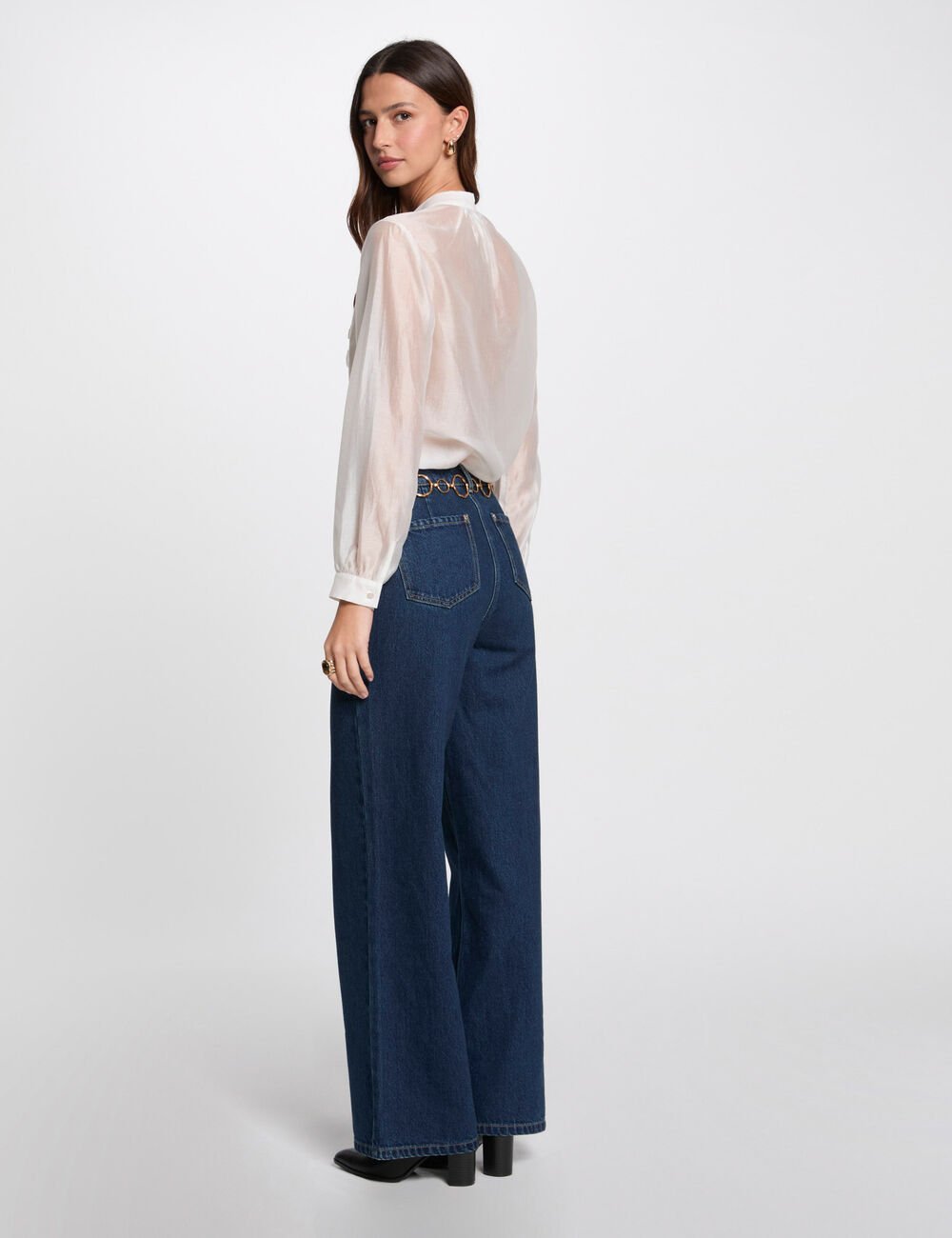 A Cholie Blouse apresenta tecido semi-transparente e detalhe de folho junto ao decote, criando um visual feminino e delicado. O corte direito equilibra leveza e elegância.
