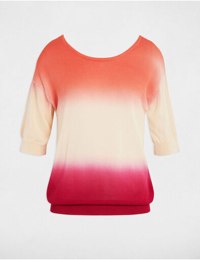 Camisola de malha fina, com mangas a 3/4, corte direito, decote redondo à frente e decote em V atrás. Efeito tie and dye.