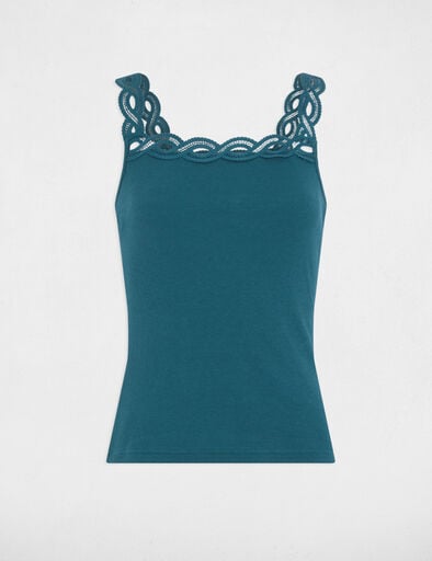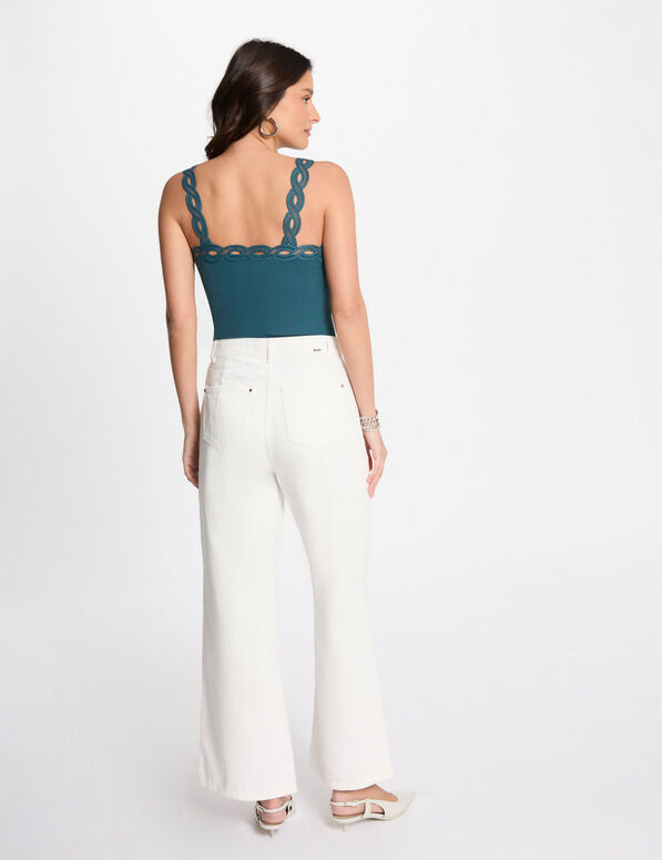 Top decote quadrado, modelo justo efeito canelado, com alças e decote em tiras de renda .