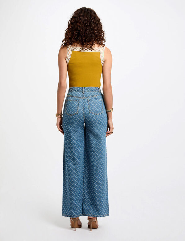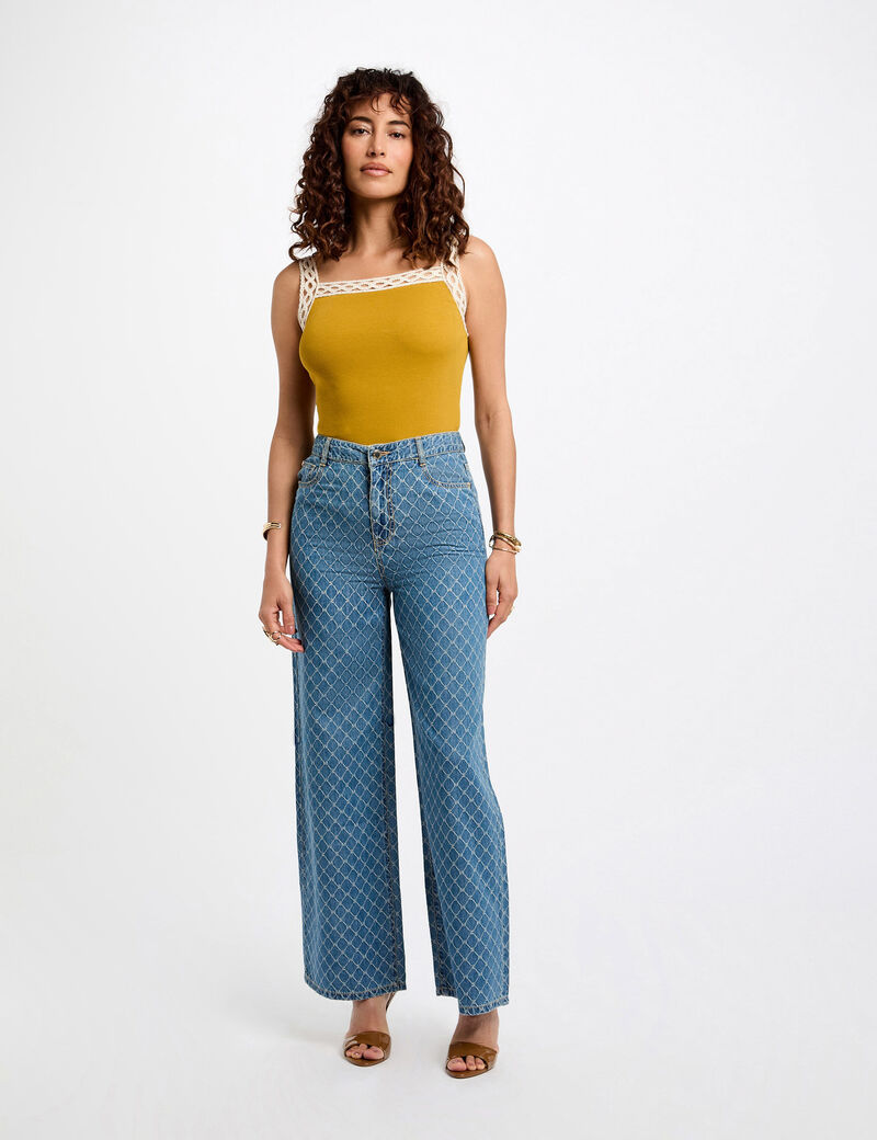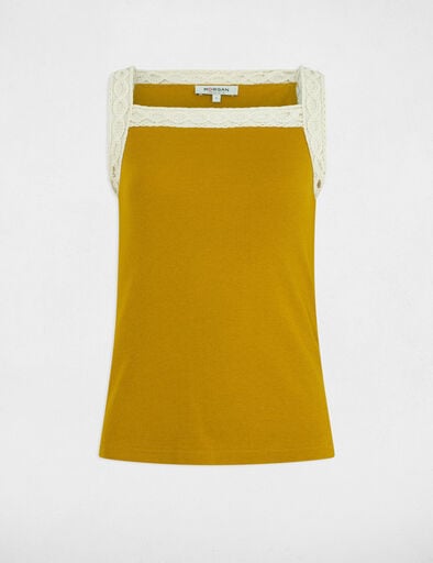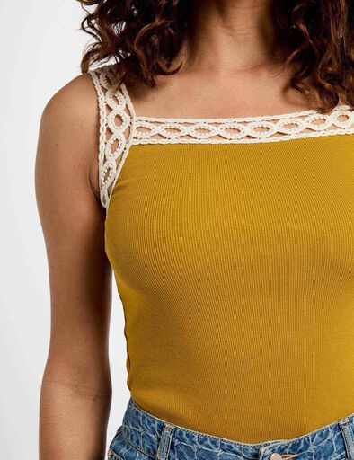 Top sem mangas, com efeito canelado, alça larga, decote quadrado. Efeito contraste e trabalhado nas alças e decote.