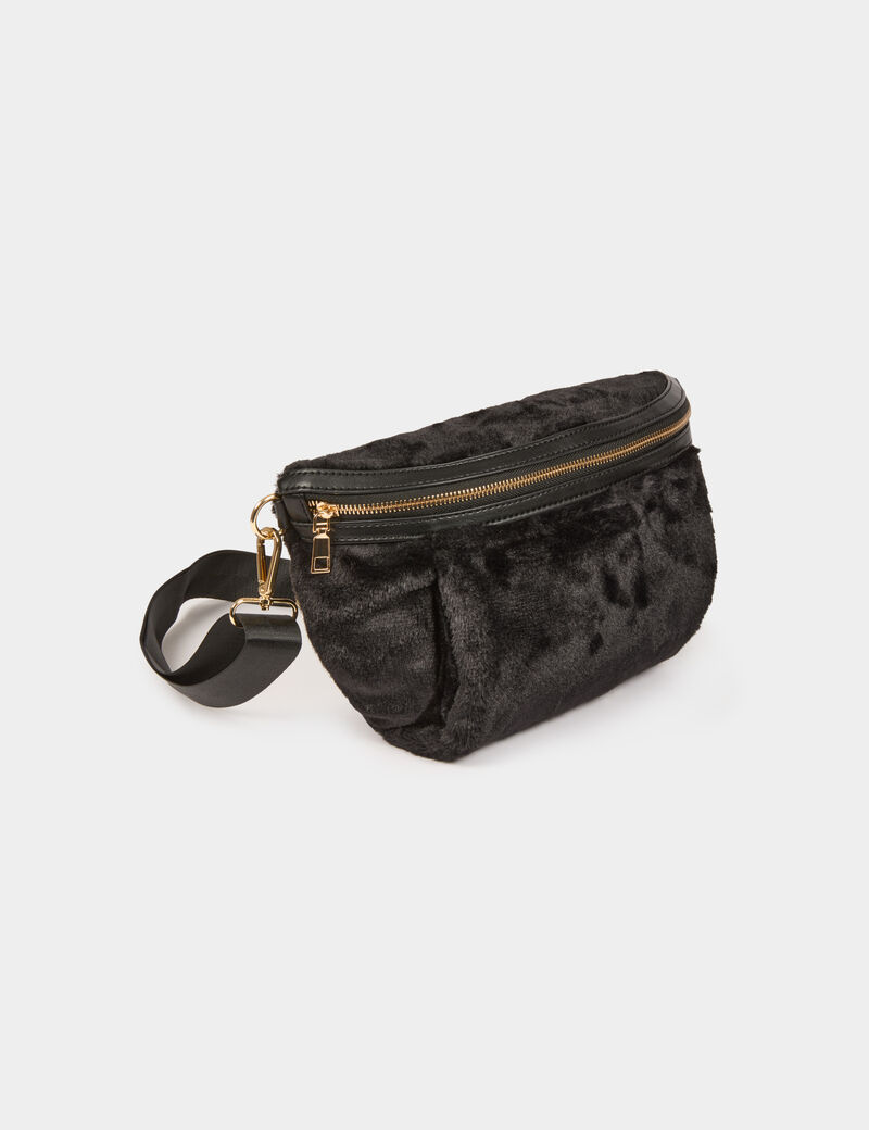 A mala de pelo de pele sintética valoriza um macacão fluido e botas de salto, alcançando o equilíbrio perfeito entre sofisticação e modernidade.