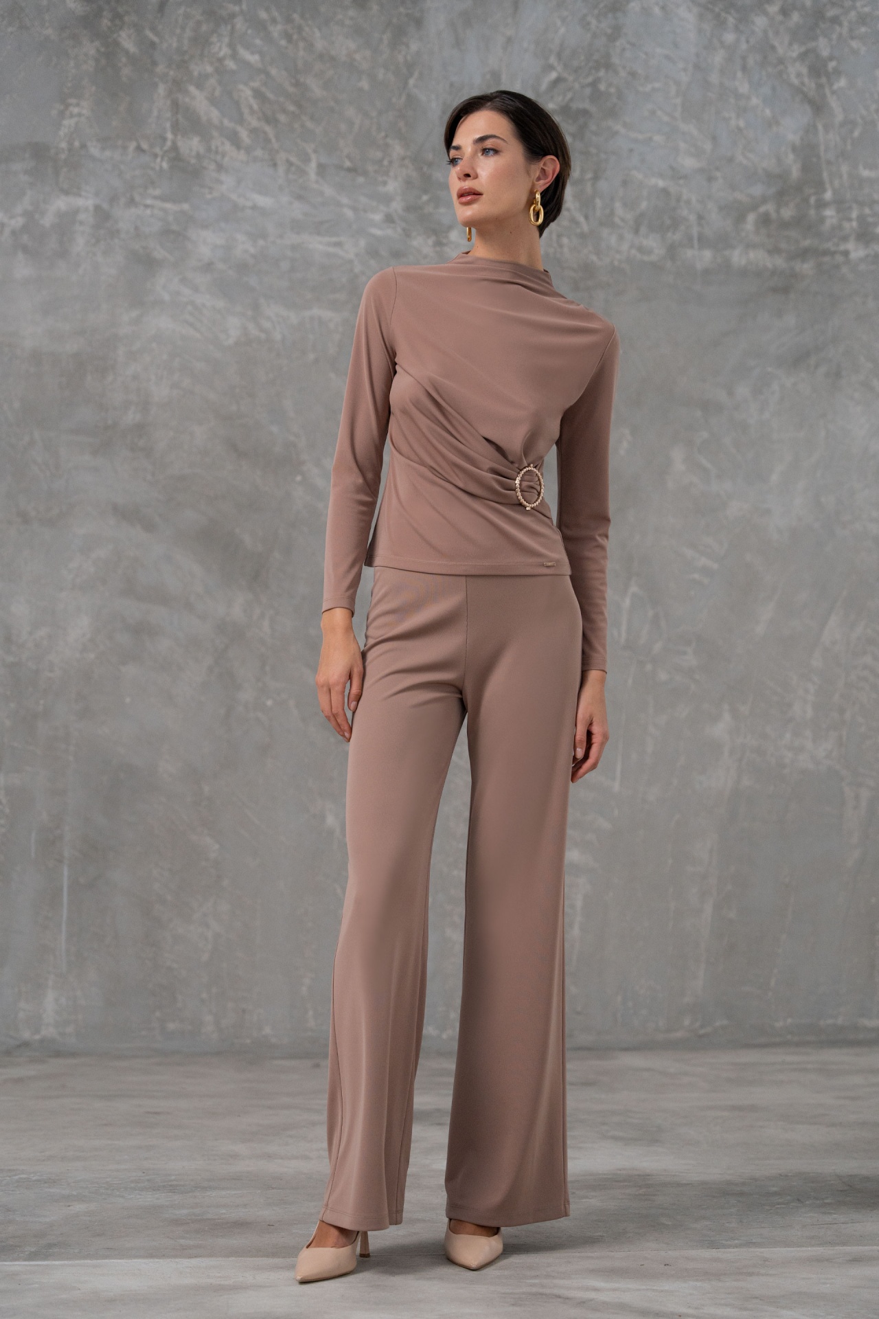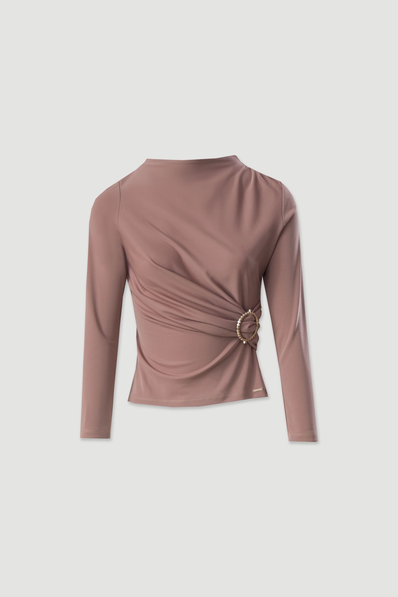 Camisola de malha com gola subida e manga comprida. Detalhe de franzido no ombro e na frente, com aplicação metálica que adiciona um toque moderno ao design.