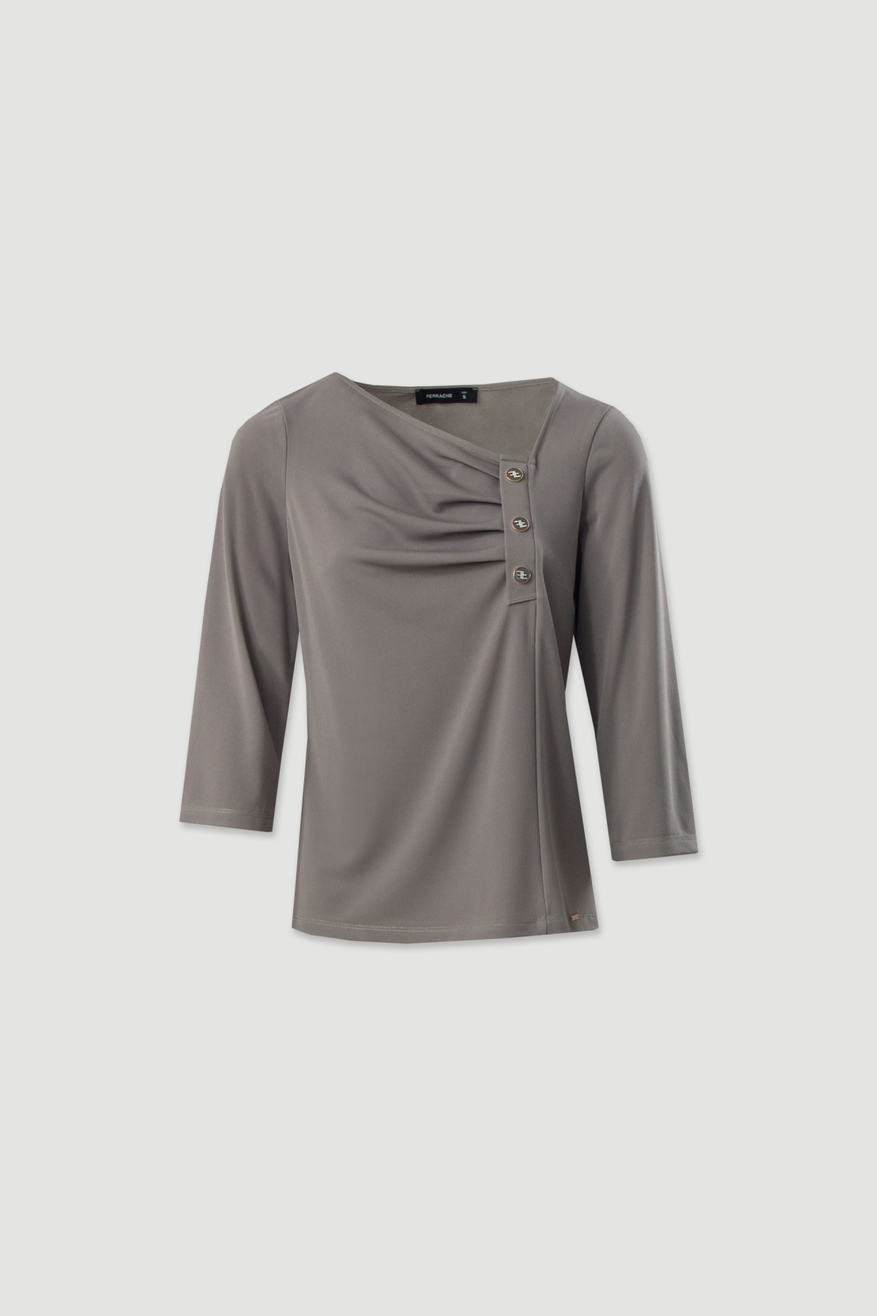 Camisola de malha com manga 3/4, ideal para um look elegante e confortável. O decote redondo destaca-se pelo pormenor drapeado com botões frontais, acrescentando um toque sofisticado e moderno. Uma peça versátil, perfeita para combinar com diferentes estilos.