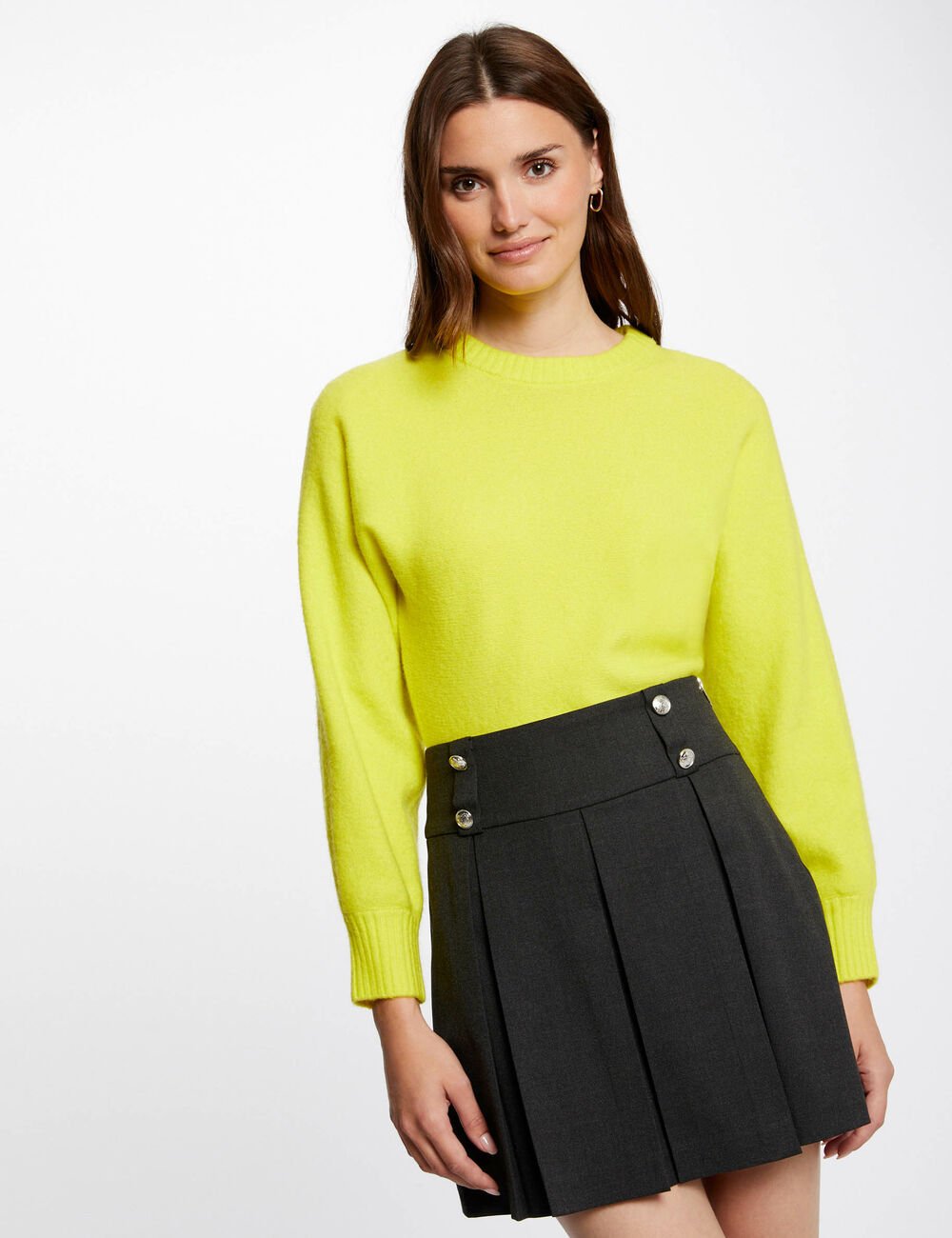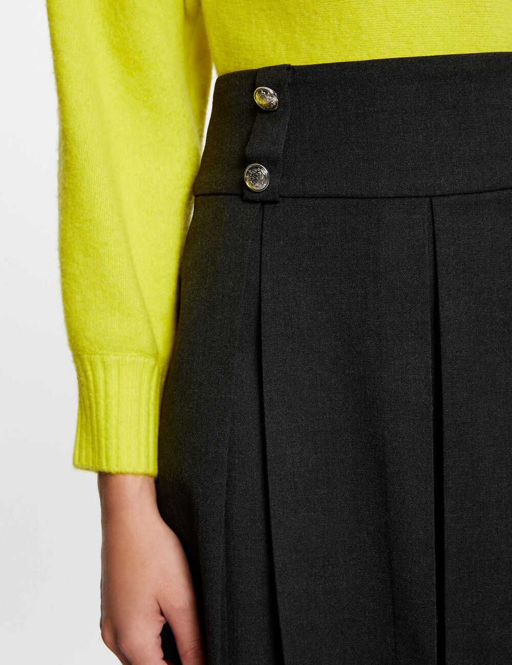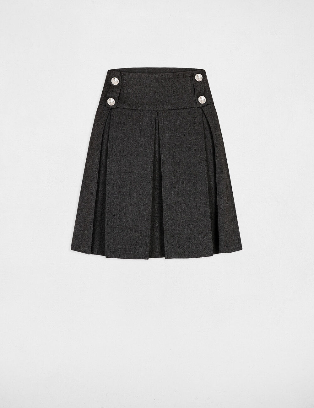 Saia curta, com corte em A, plissada. Cintura subida e fecho na lateral. Botões decorativos na lateral da cintura.