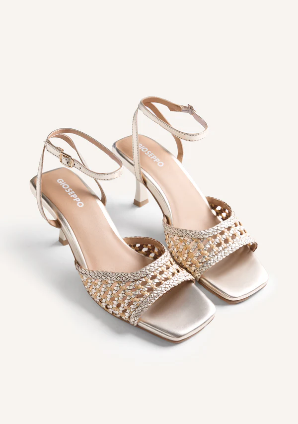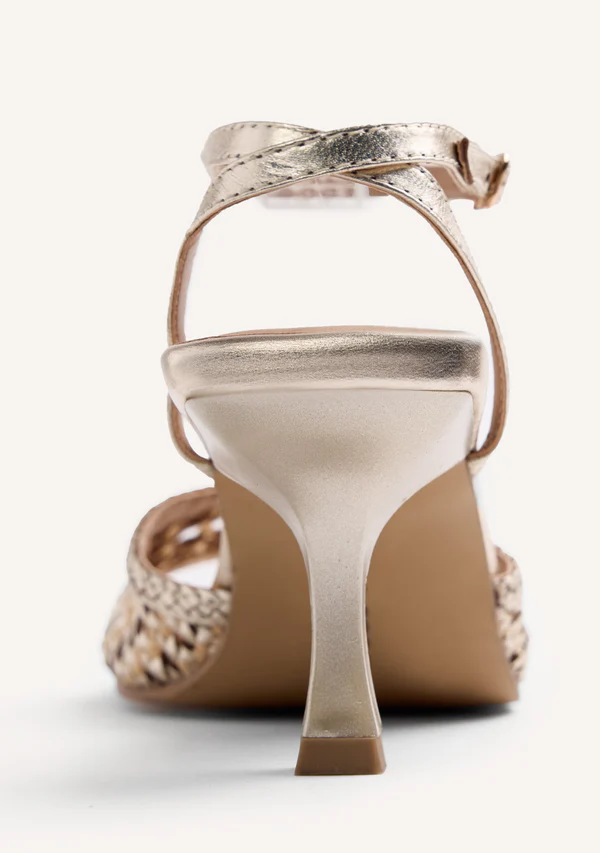 As Kajiado Woven Leather Heel Sandals combinam elegância e leveza num design feminino e sofisticado. O couro entrançado com acabamento metálico acrescenta textura e brilho subtil, enquanto o salto fino alonga a silhueta com delicadeza.