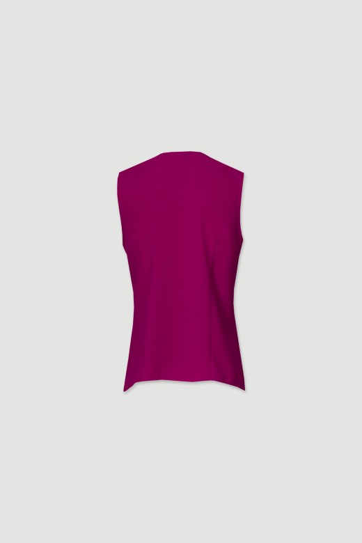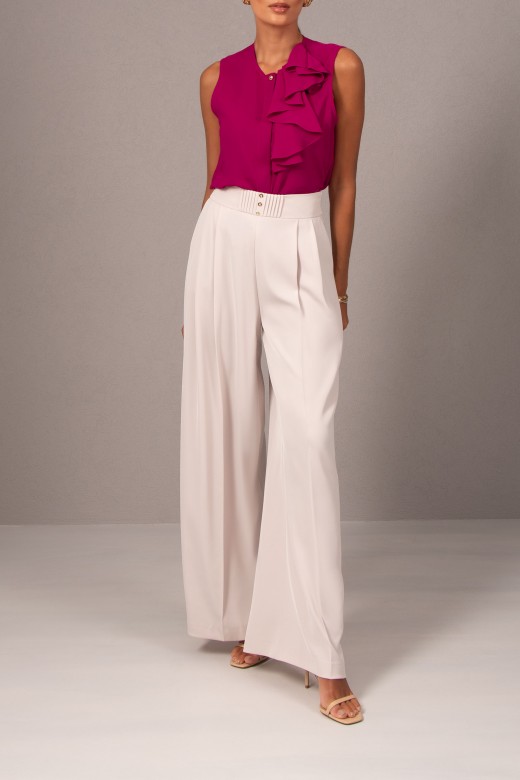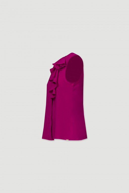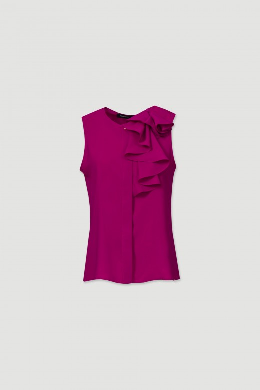 Blusa de cavas, com tecido fluido e elegante. Decote redondo com aplicação de tecido a fazer efeito de folho.