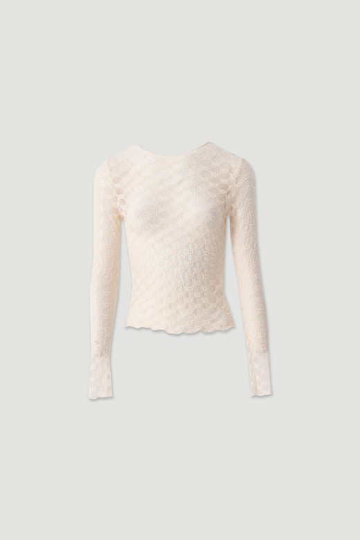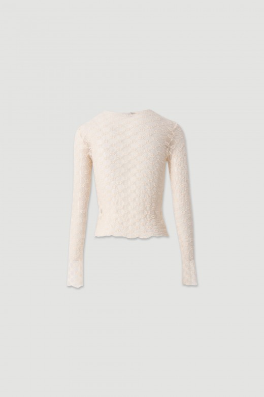 Camisola feminina em renda delicada com padrão floral que acrescenta textura e sofisticação à peça. O corte ajustado valoriza a silhueta, enquanto o decote redondo e as mangas compridas criam uma imagem feminina e leve.