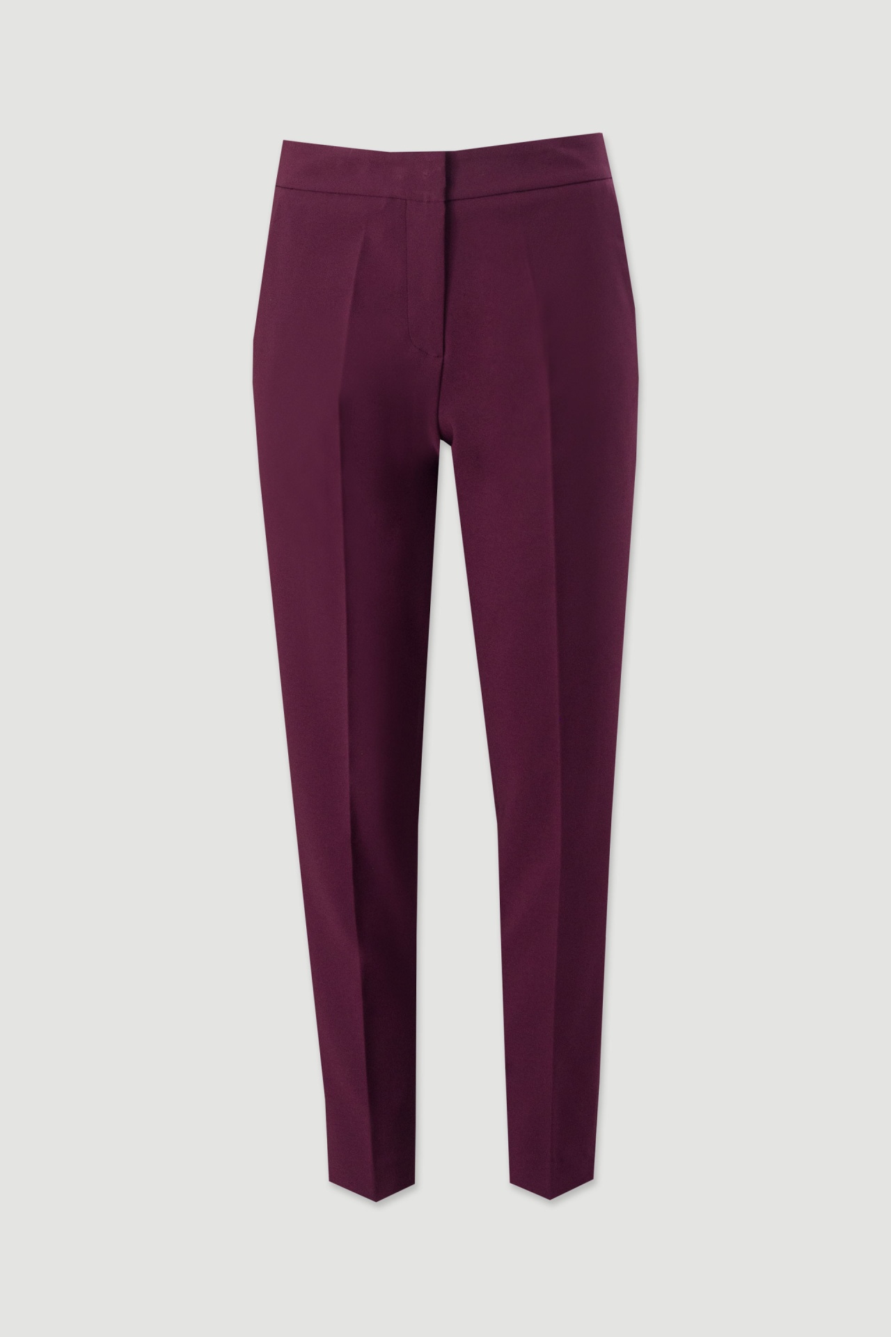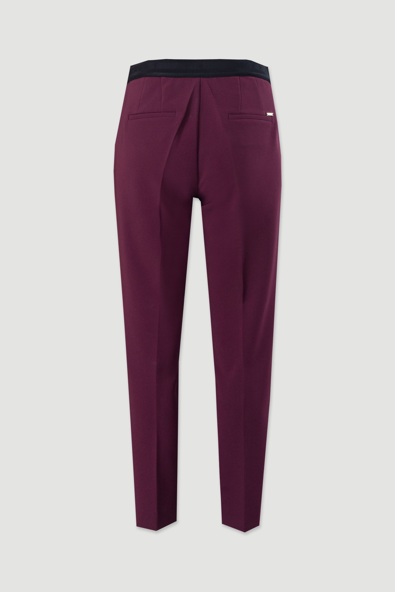 Calça de corte clássico com cintura subida. O detalhe de cinto elástico com logótipo na parte posterior acrescenta um toque moderno e discreto. Fecho frontal com gancho e botão interior para um ajuste confortável e seguro. Com bolsos laterais funcionais e bolso falso na parte posterior, é uma peça versátil para coordenados sofisticados e profissionais.