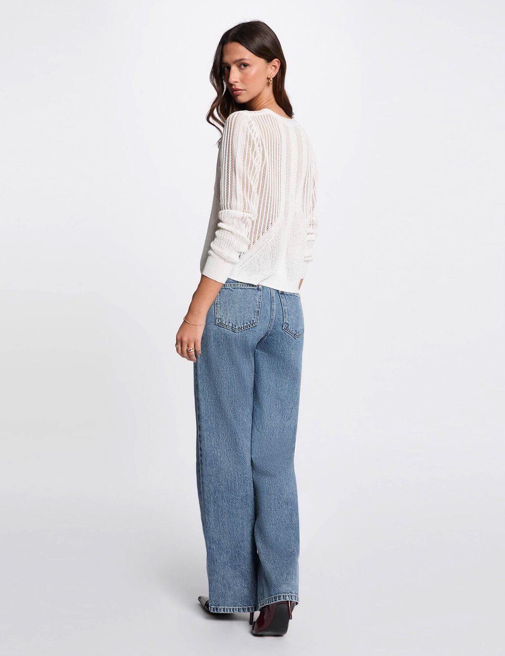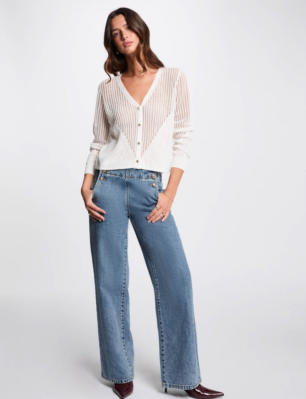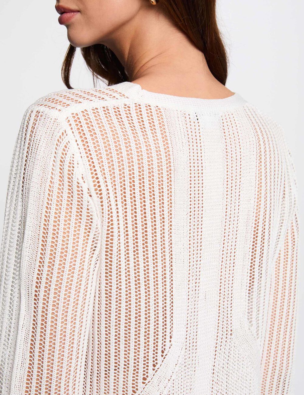 O cardigan MAGATHE apresenta malha fina trabalhada com fio metalizado que acrescenta brilho elegante.