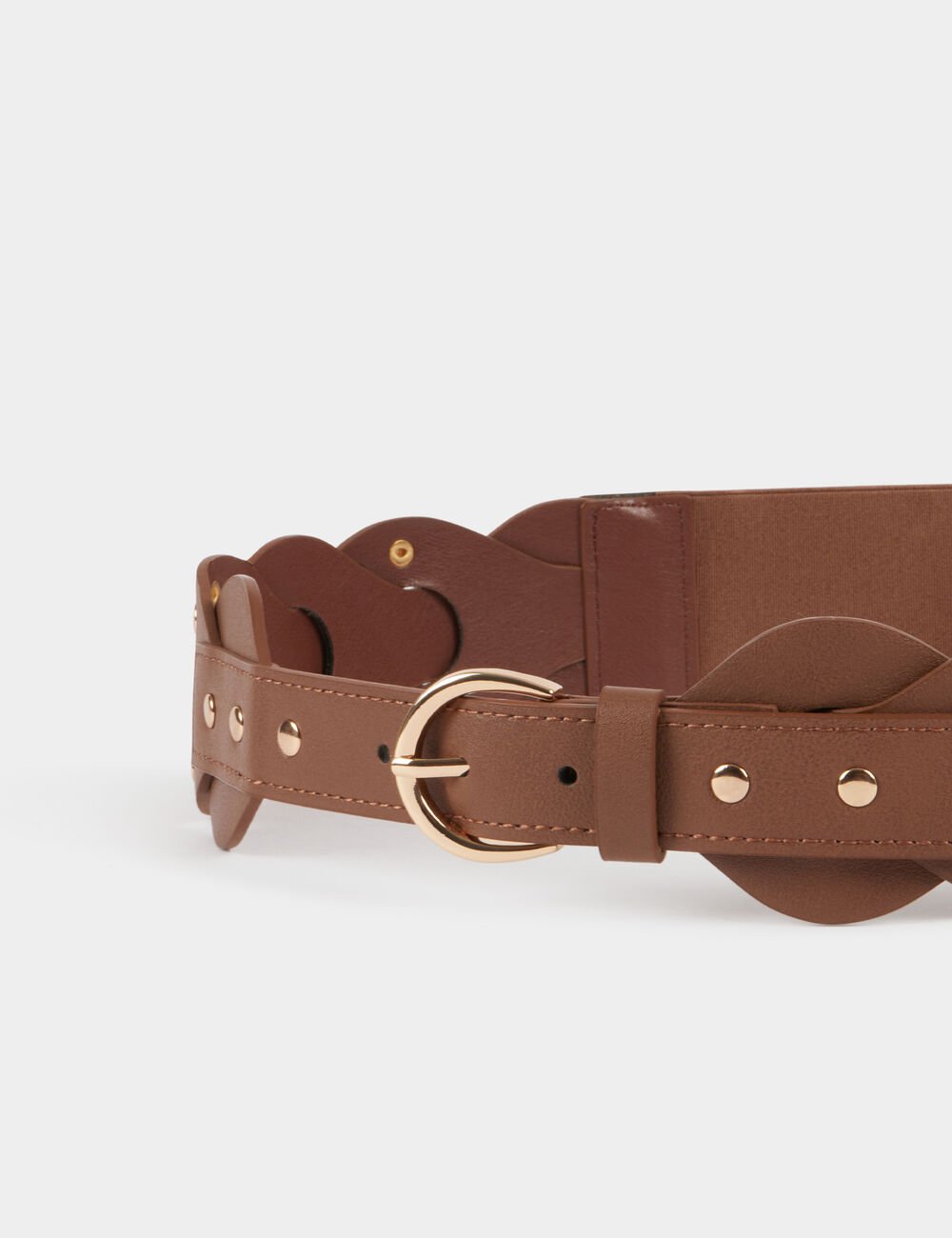 Cinto elástico com detalhes metálicos à frente. Ajustável com fivela metálica na frente.