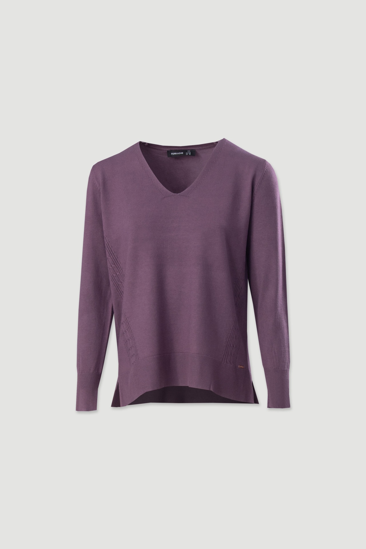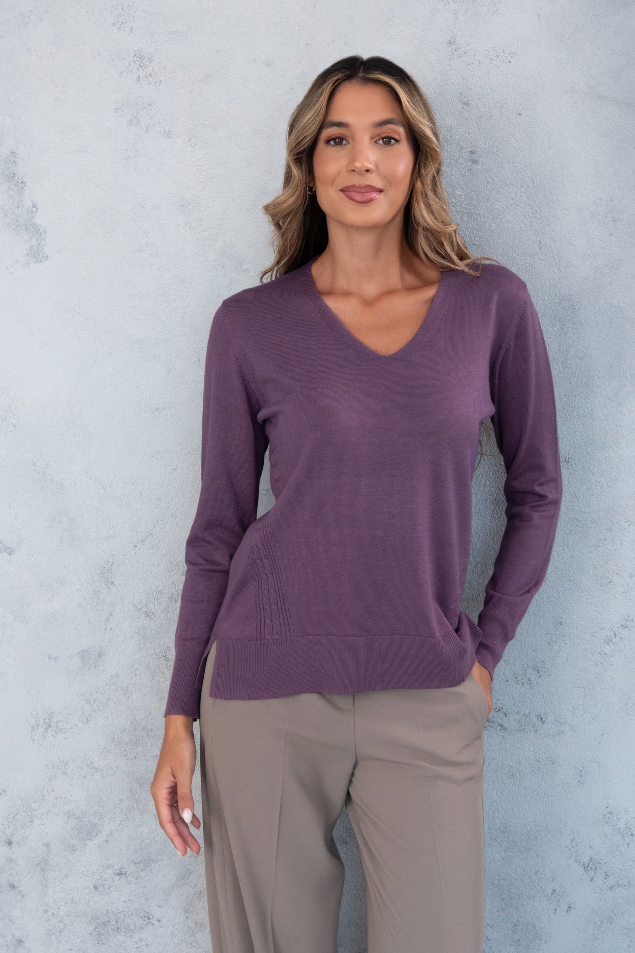 Túnica de malha fina com decote em V e corte ligeiramente alongado. Os detalhes em malha trabalhada nas laterais acrescentam sofisticação subtil, enquanto as aberturas laterais garantem conforto e fluidez ao movimento. Uma peça versátil e elegante, ideal para looks do dia a dia com um toque moderno.