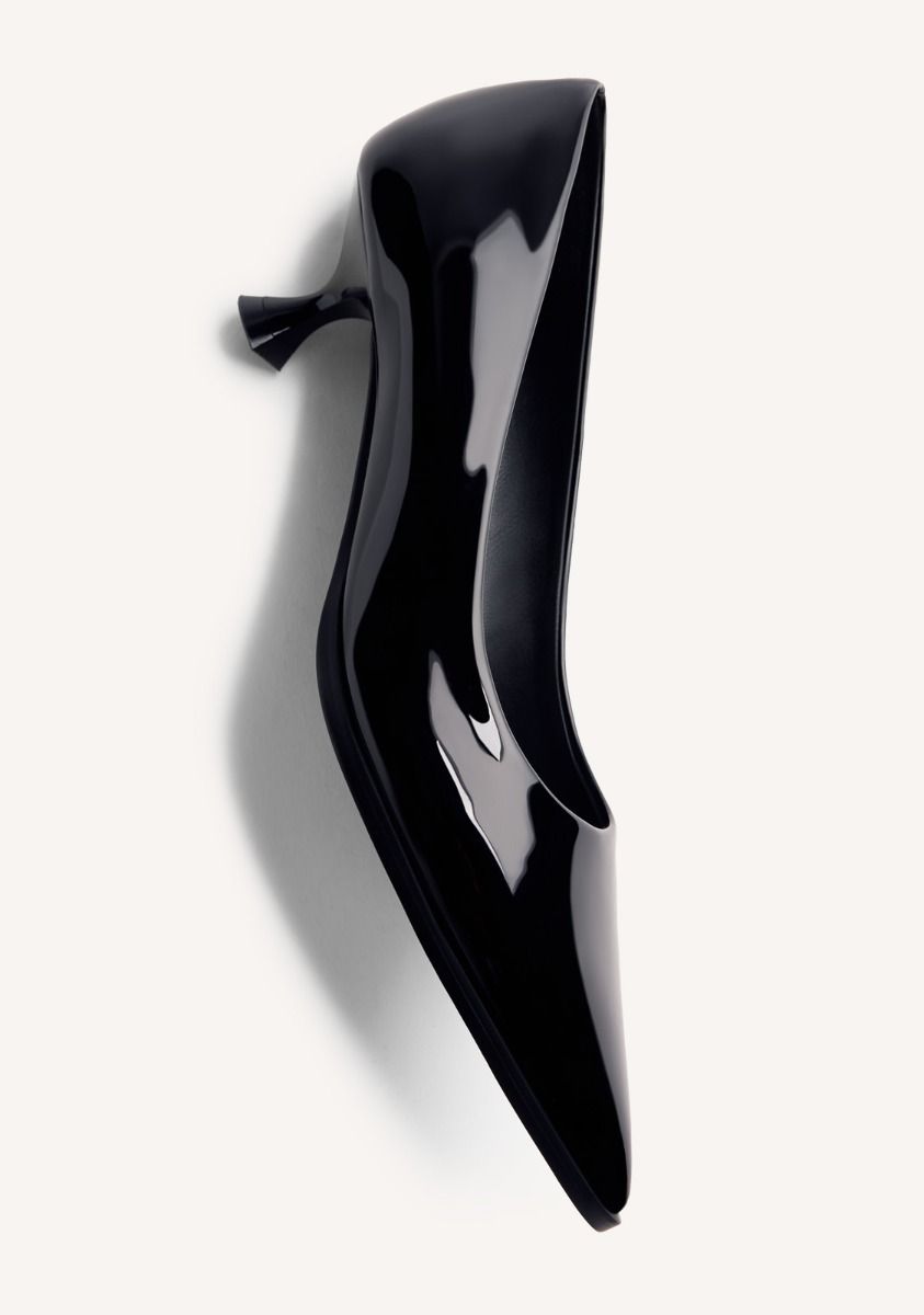 Sapatos com efeito de verniz, bico fino e salto carretel. Têm uma sola acolchoada. Altura do salto: 4 cm. Forro, cabedal e sola em poliuretano. Sola de borracha flexível.