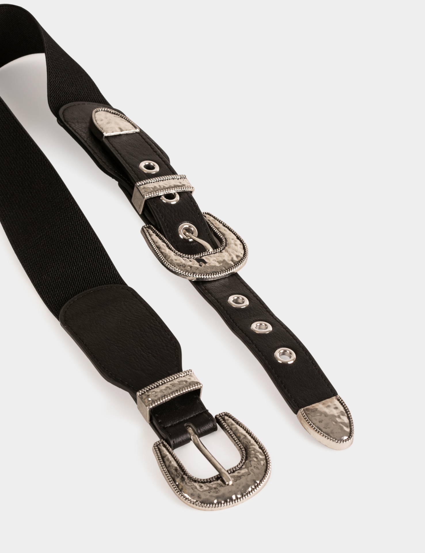 Cinto com elástico atrás, e fivela dupla, ajustável, prateada e trabalhada, na frente.