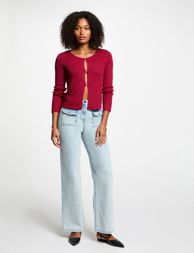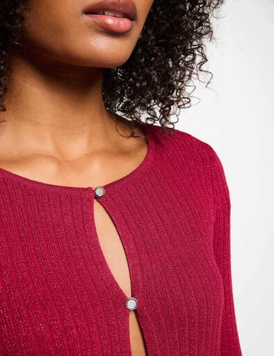 Cardigan de mangas compridas, com corte justo, decote redondo e malha fina canelada. Três botões na frente. Fio metalizado na maha.