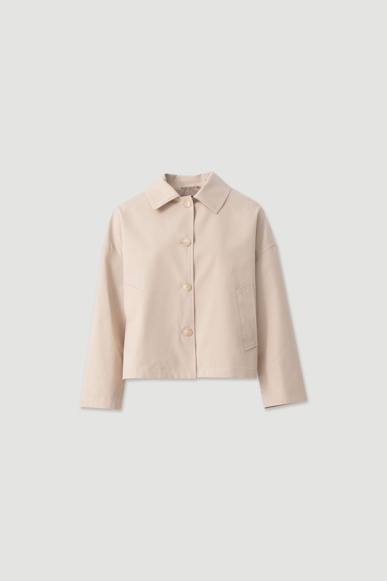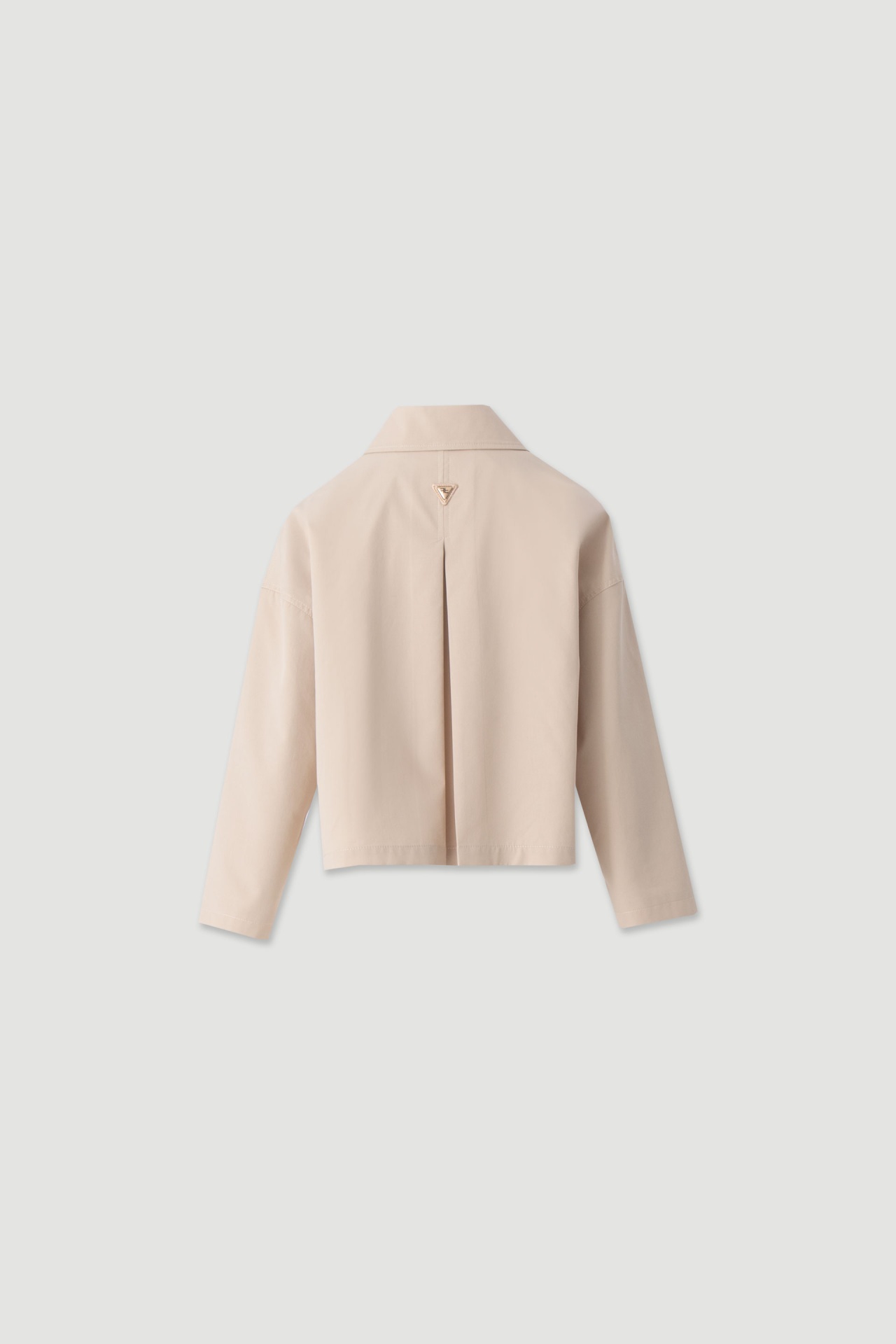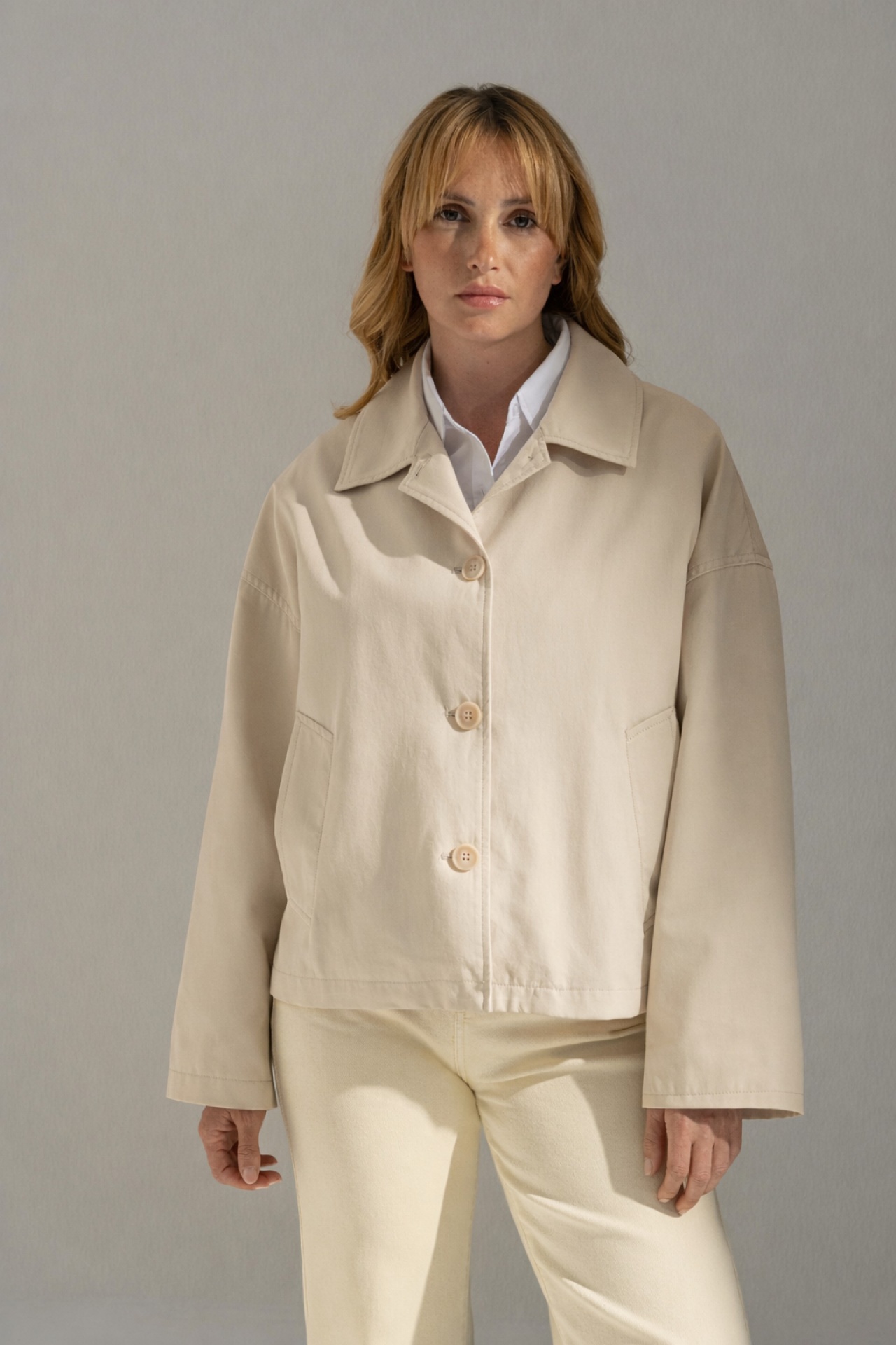 Gabardine curta em algodão com design minimalista e contemporâneo. O corte ligeiramente solto, aliado à prega central nas costas, confere movimento e conforto à peça.