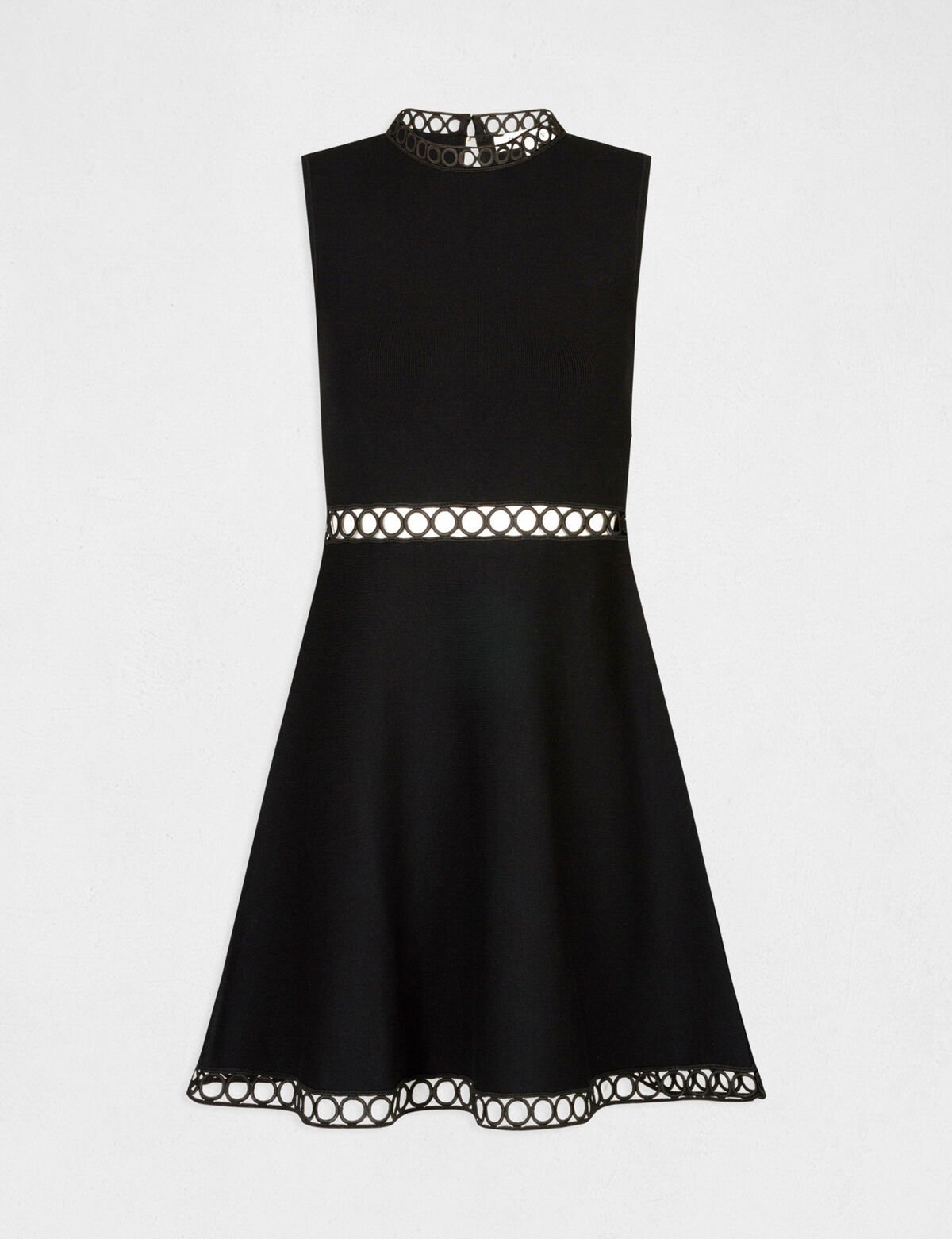 Vestido malha curto, estilo skater com detalhes abertos na cintura, em baixo e na gola alta. Sem mangas. Abertura pequena com botão atrás.
