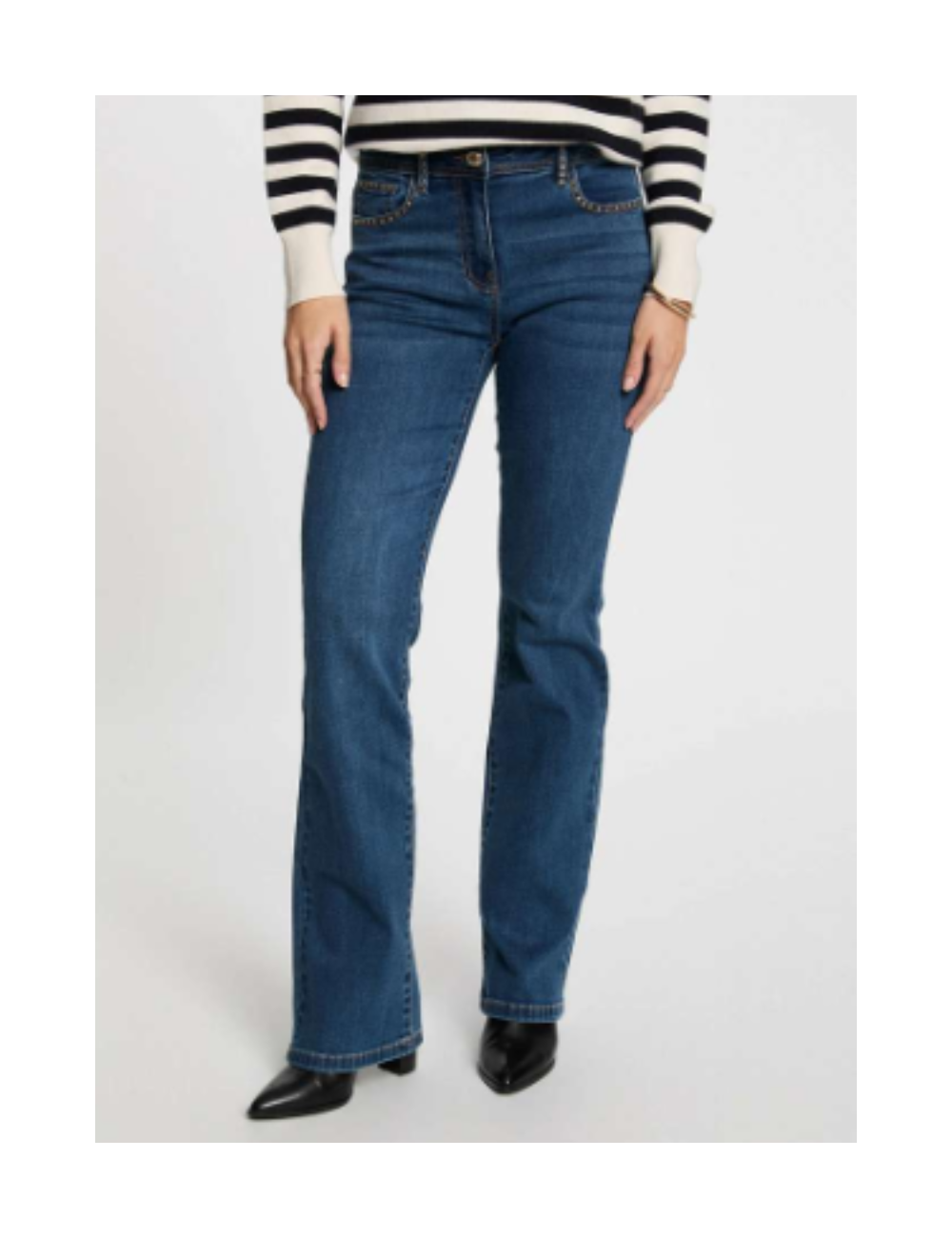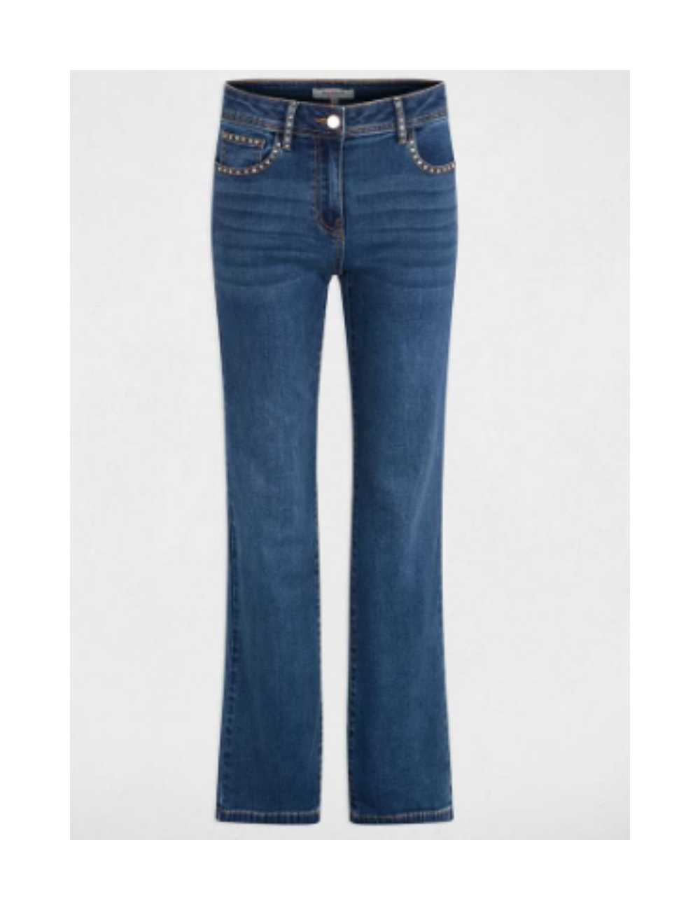 Calça de ganga, com corte boot-cut, com cinco bolsos. Detalhes metálicos na frente junto à cintura.