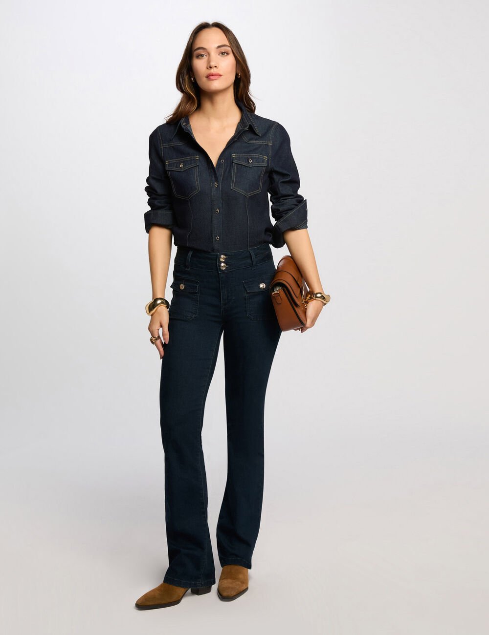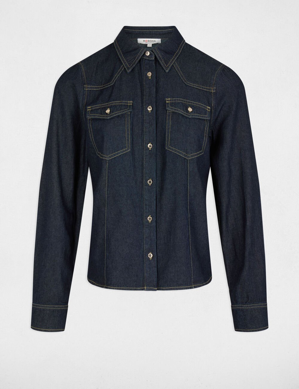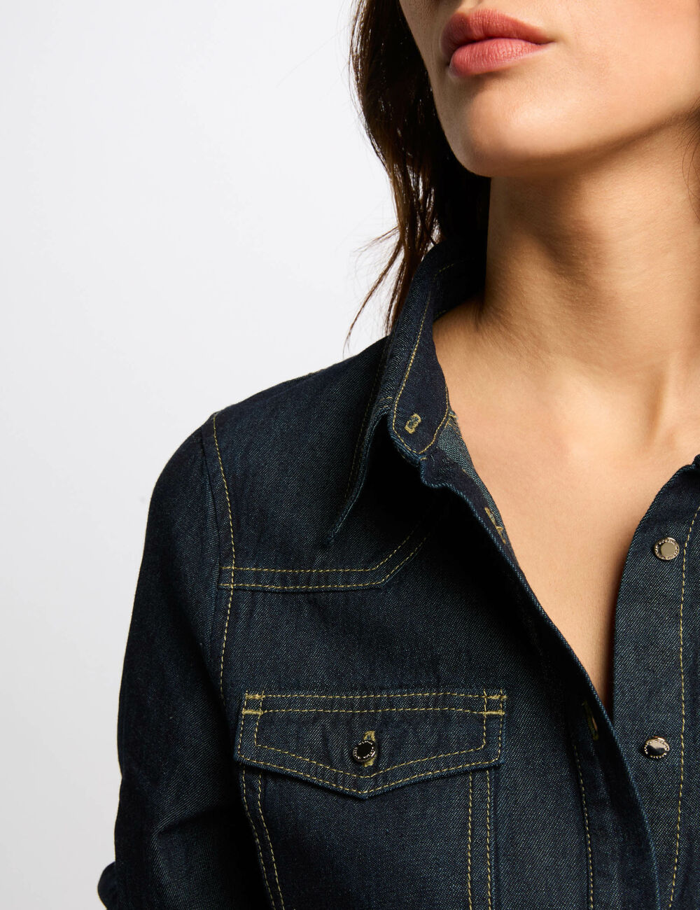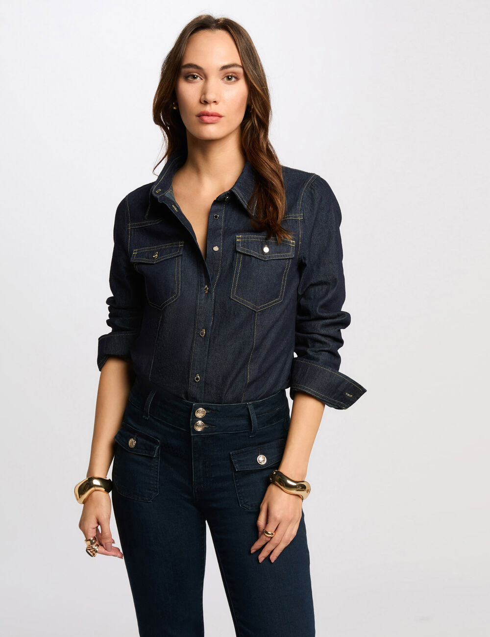 Camisa de ganga escura, com mangas compridas e colarinho lapela. Corte cintado. Dois bolsos com pala e botão no peito. Botões na frente.
