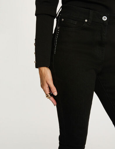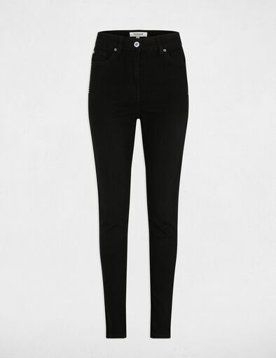 Calça jeans com corte slim fit de cinco bolsos, que valoriza a silhueta com seu corte feminino e justo. Cintura alta modela as curvas harmoniosamente, alongando as pernas. Os detalhes metálicos adicionam um toque moderno e chique, perfeito para um look elegante do dia a dia.