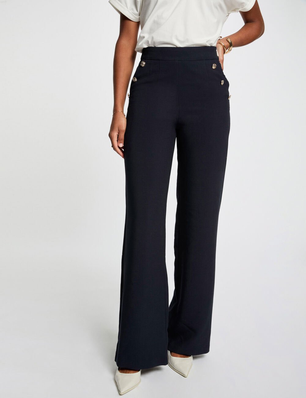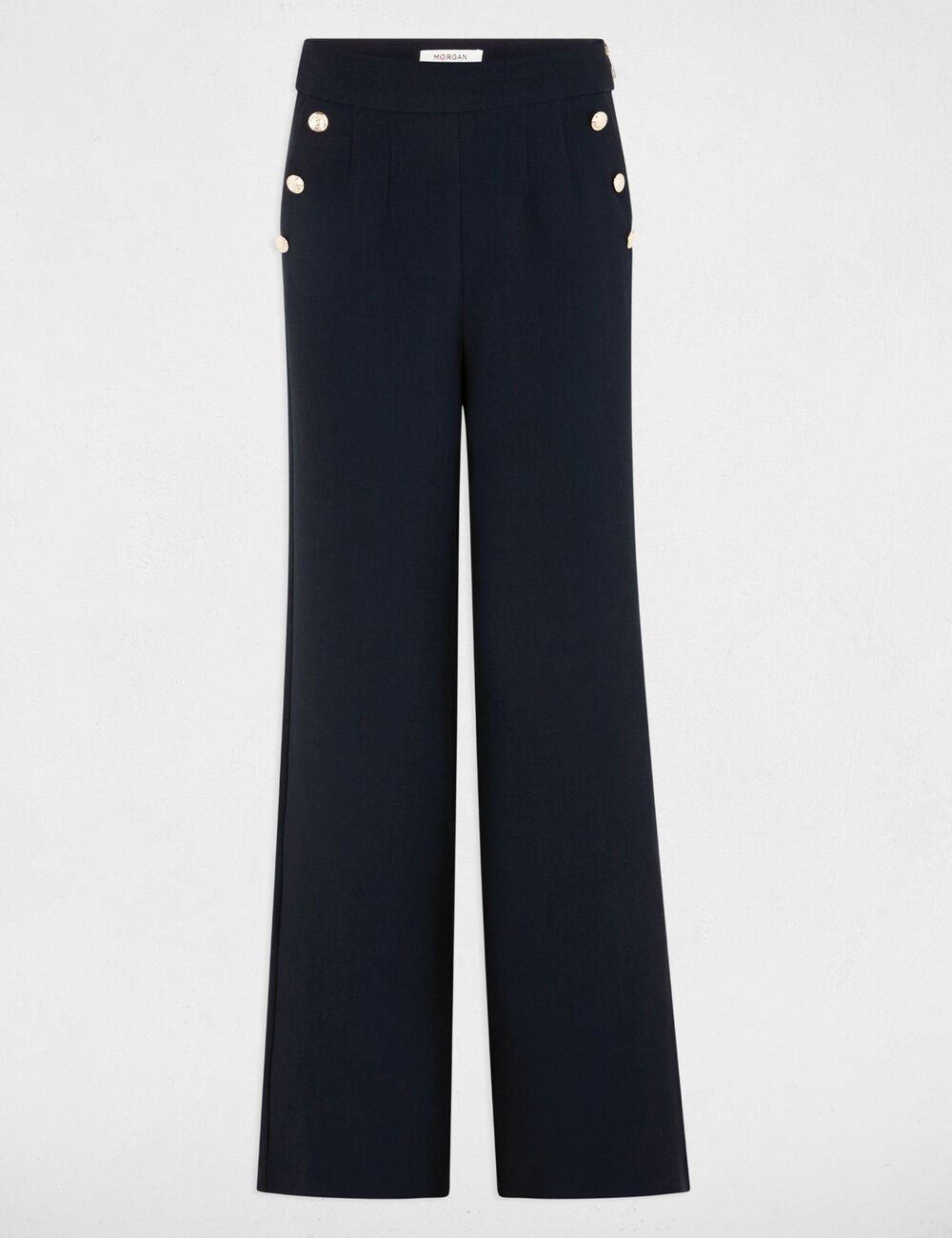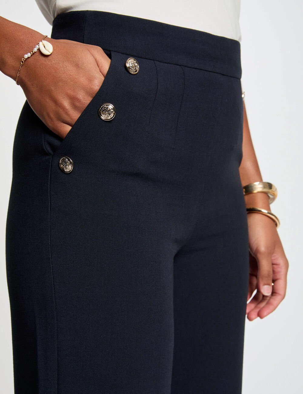 Calça estilo wide leg, com botões decorativos efeito marinheiro nos bolsos. Cintura média e fecho lateral. Dois bolsos italianos na frente.
