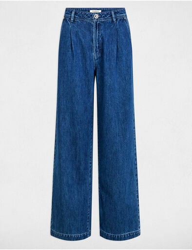 Ganga azul, de cintura subida, com corte wide leg, dois bolsos italianos na frente e dois bolsos patch atrás. Pinças na frente da cintura. Presilhas para cinto.