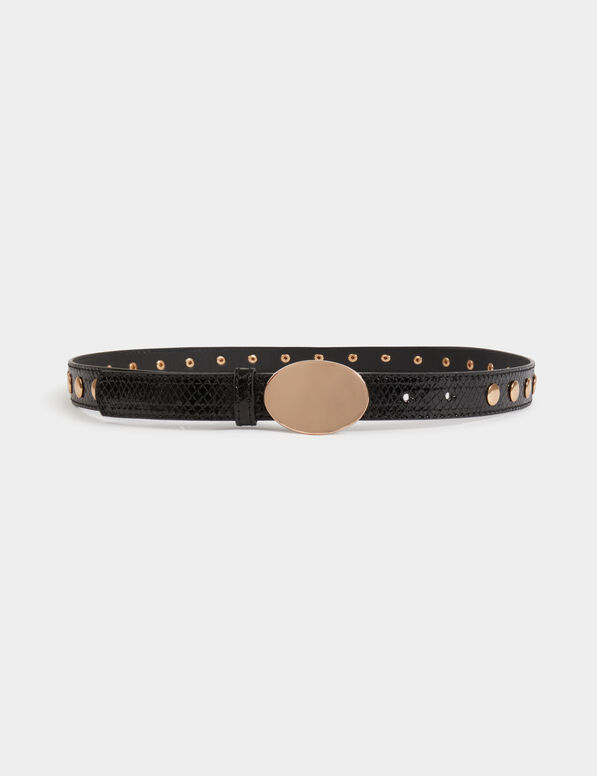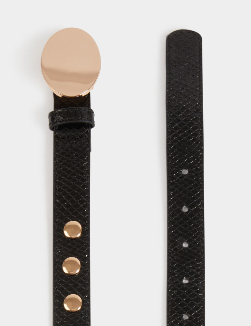 Este cinto de pele sintática, encorpora elegância moderna com os seus detalhes sofisticados. Os botões providenciam um acabamento refinado e assertivo para um carácter único. Desenhado para definir a cintura, favorece a silhueta, adicionando um toque de tendência aos looks.