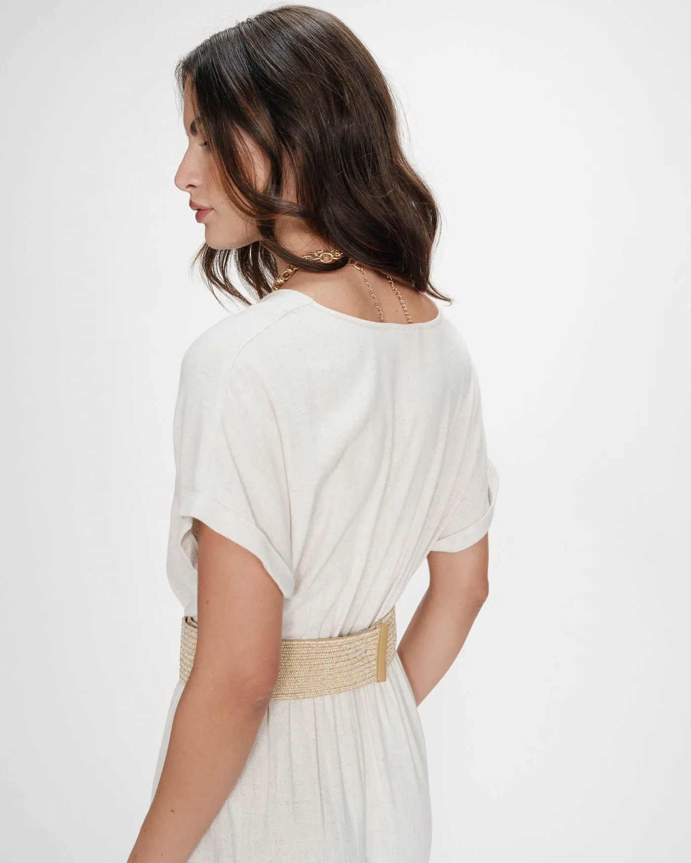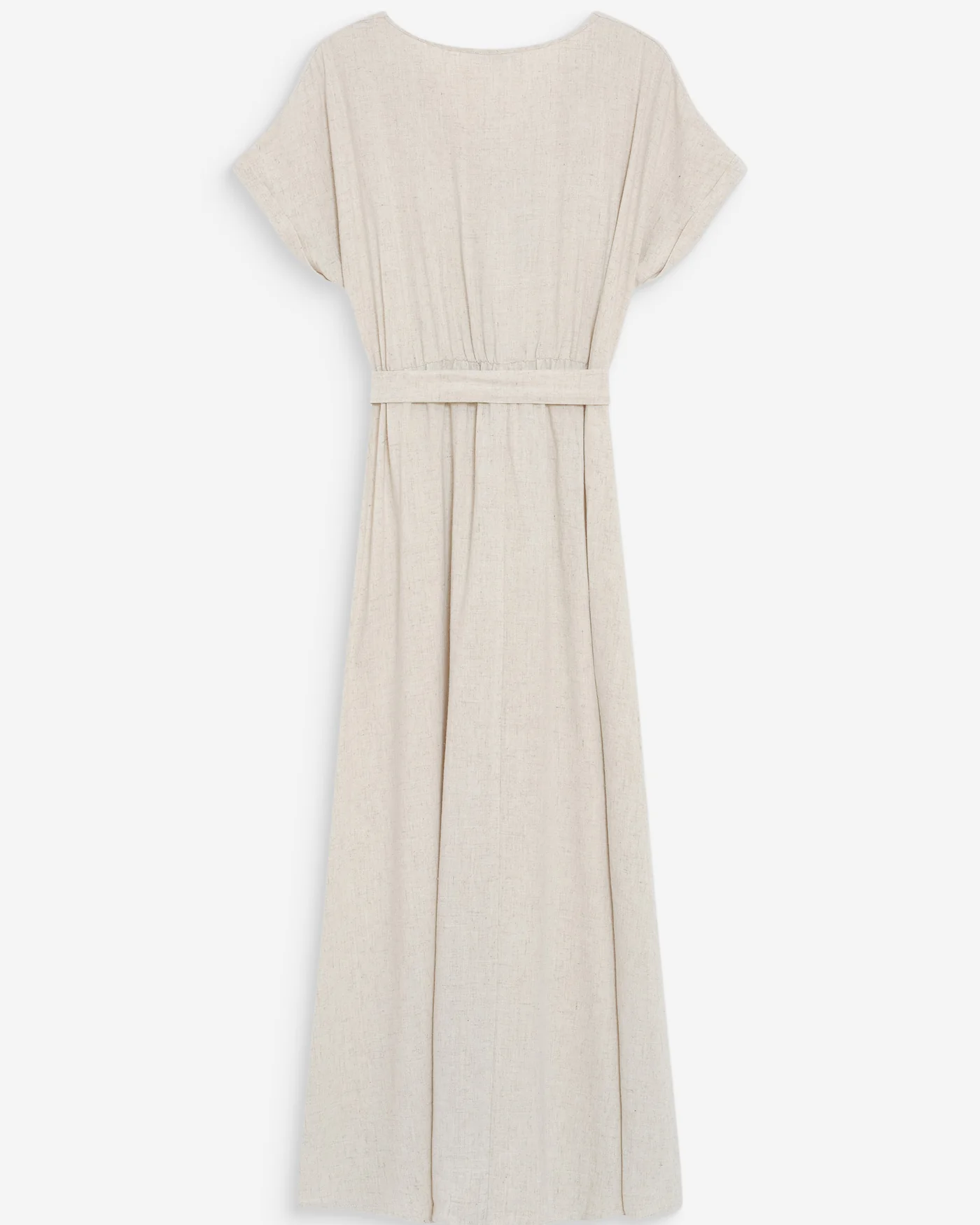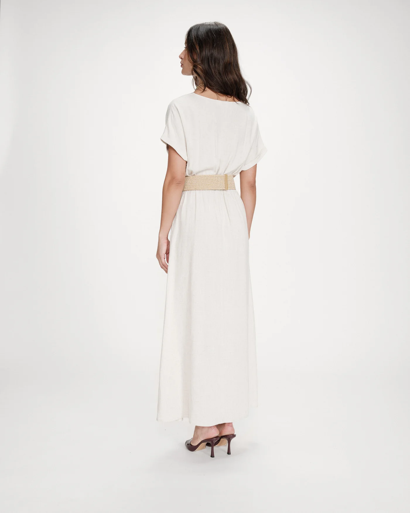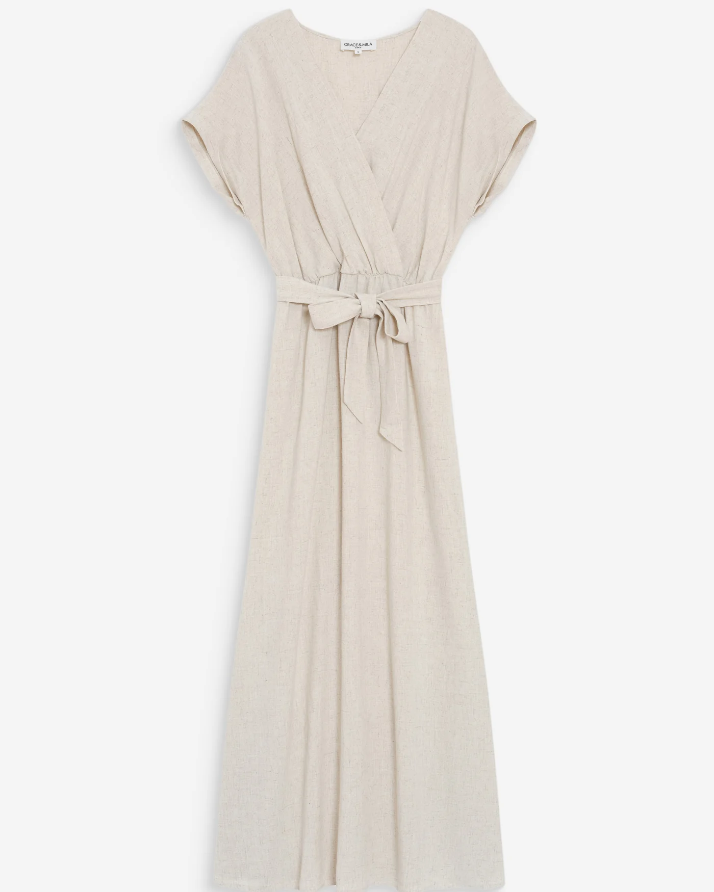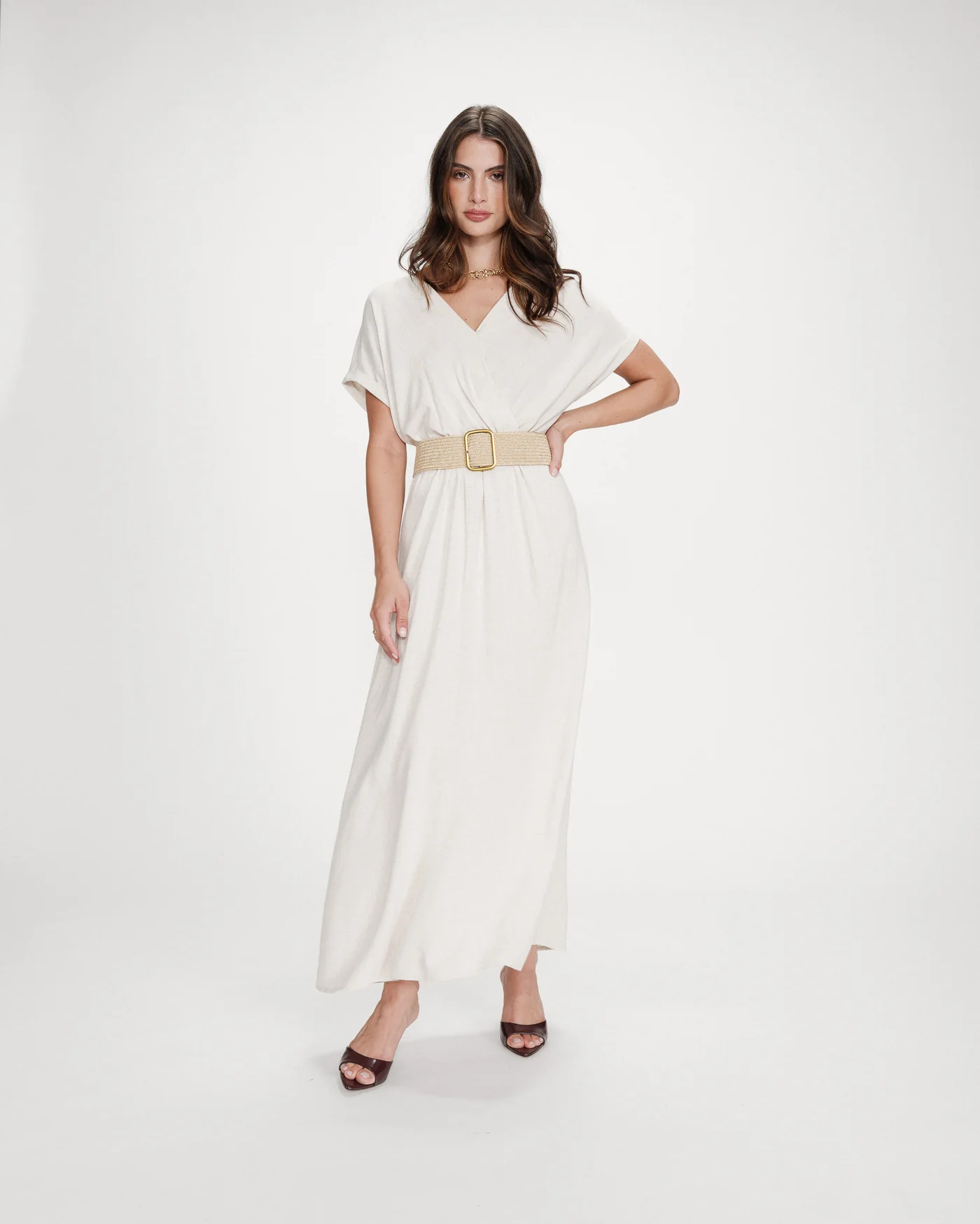 O vestido POLLEN apresenta silhueta maxi fluida e decote transpassado que valoriza a silhueta com elegância minimalista.