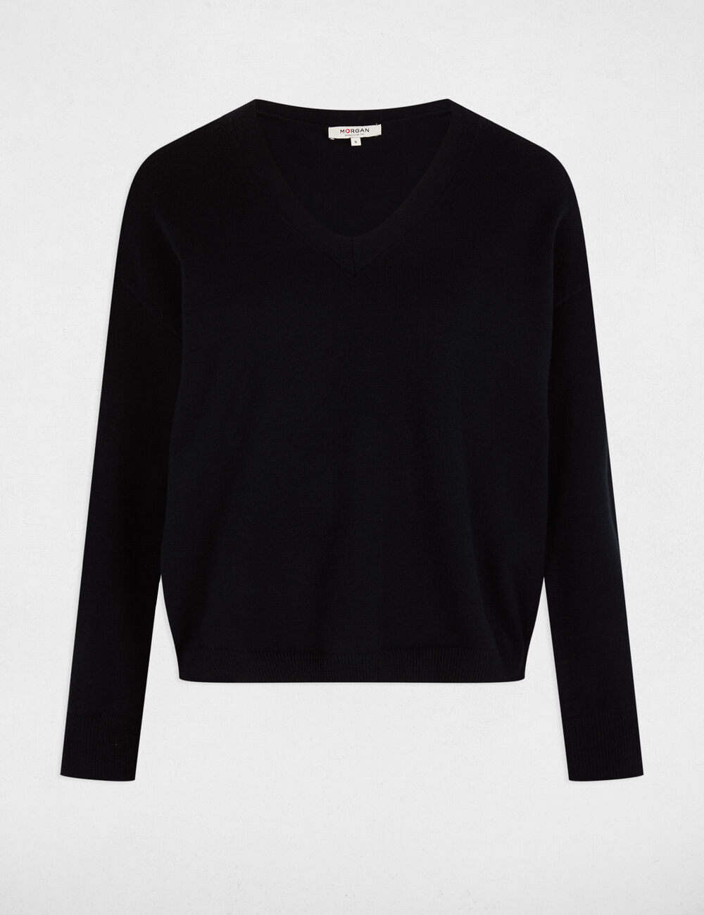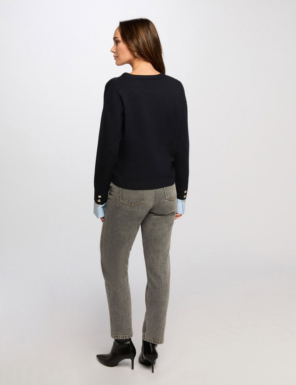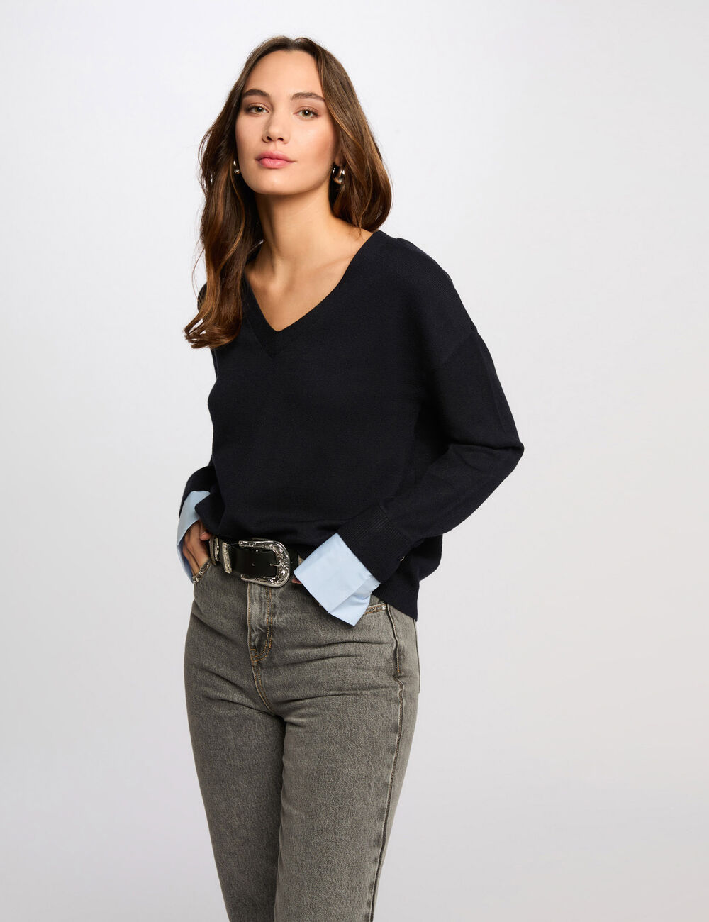 Camisola em malha fina, com decote em V, corte justo e mangas compridas. Punhos estilo camiseiro, em azul claro. Cor: Azul escuro.