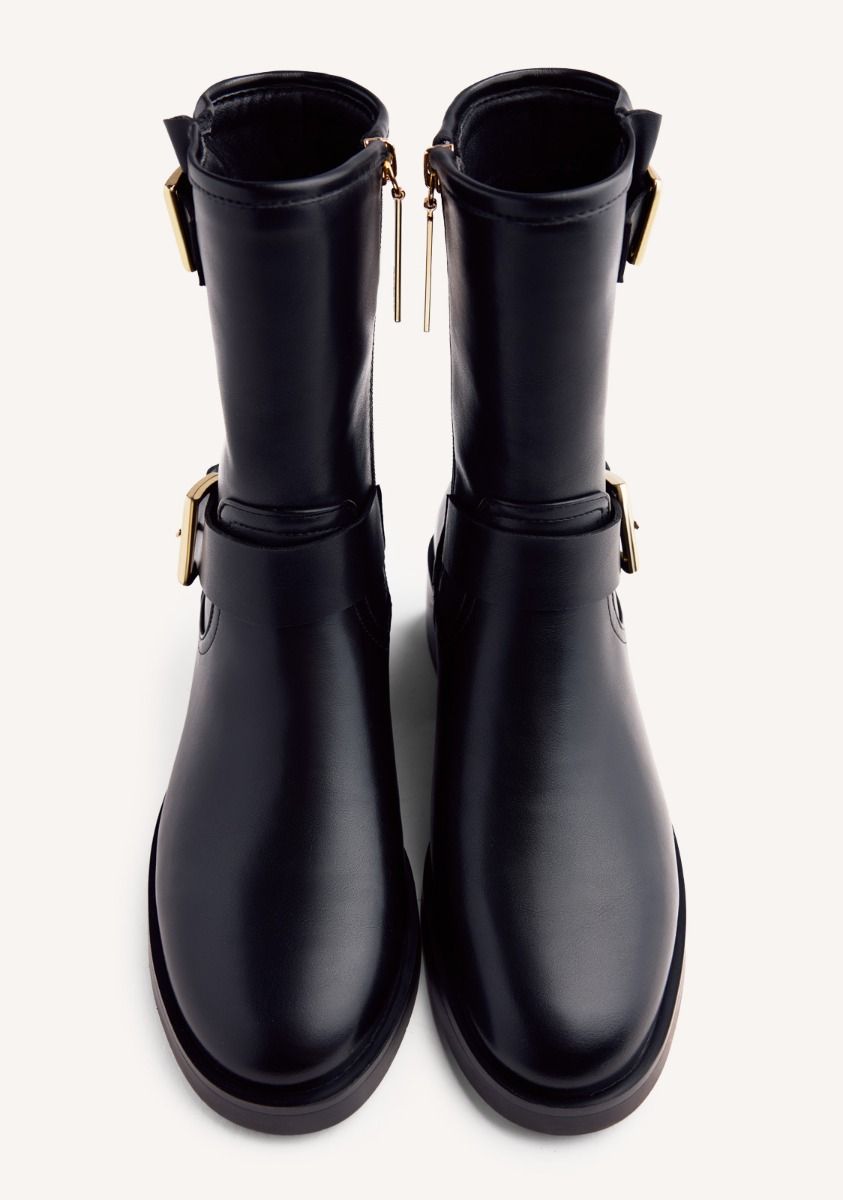 Botas estilo biker com fivelas com acabamento dourado. Cano largo, de altura média e bico arredondado. Têm uma palmilha acolchoada e um fecho na parte interna do cano. Seguimos o guia padrão da largura do eixo, ajustando a medida de acordo com o tamanho. O tamanho 37 serve em gémeos com um perímetro até 38 cm. Forro em poliéster e poliuretano. Cabedal e palmilha em poliuretano. Sola em borracha.