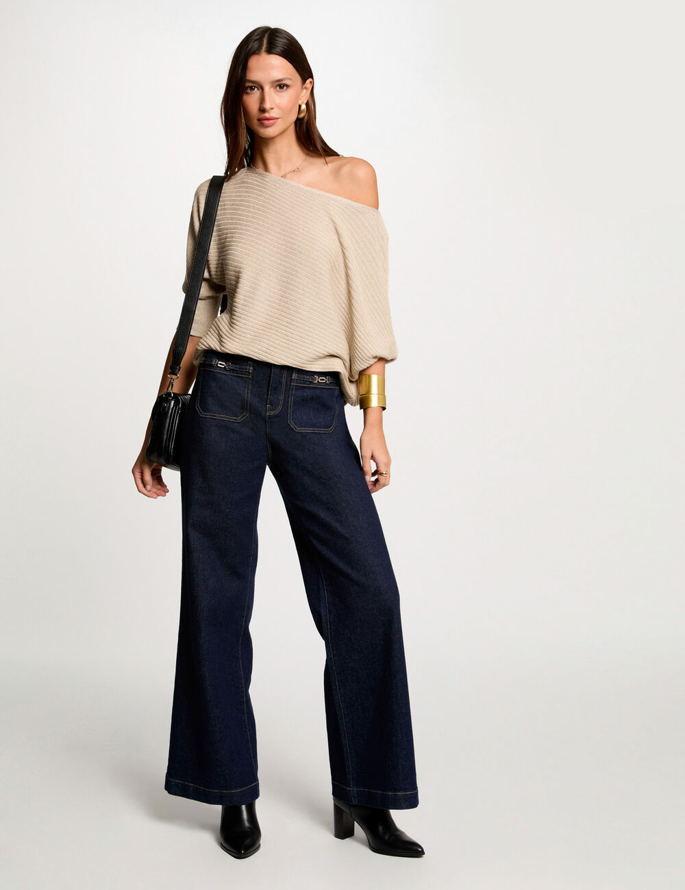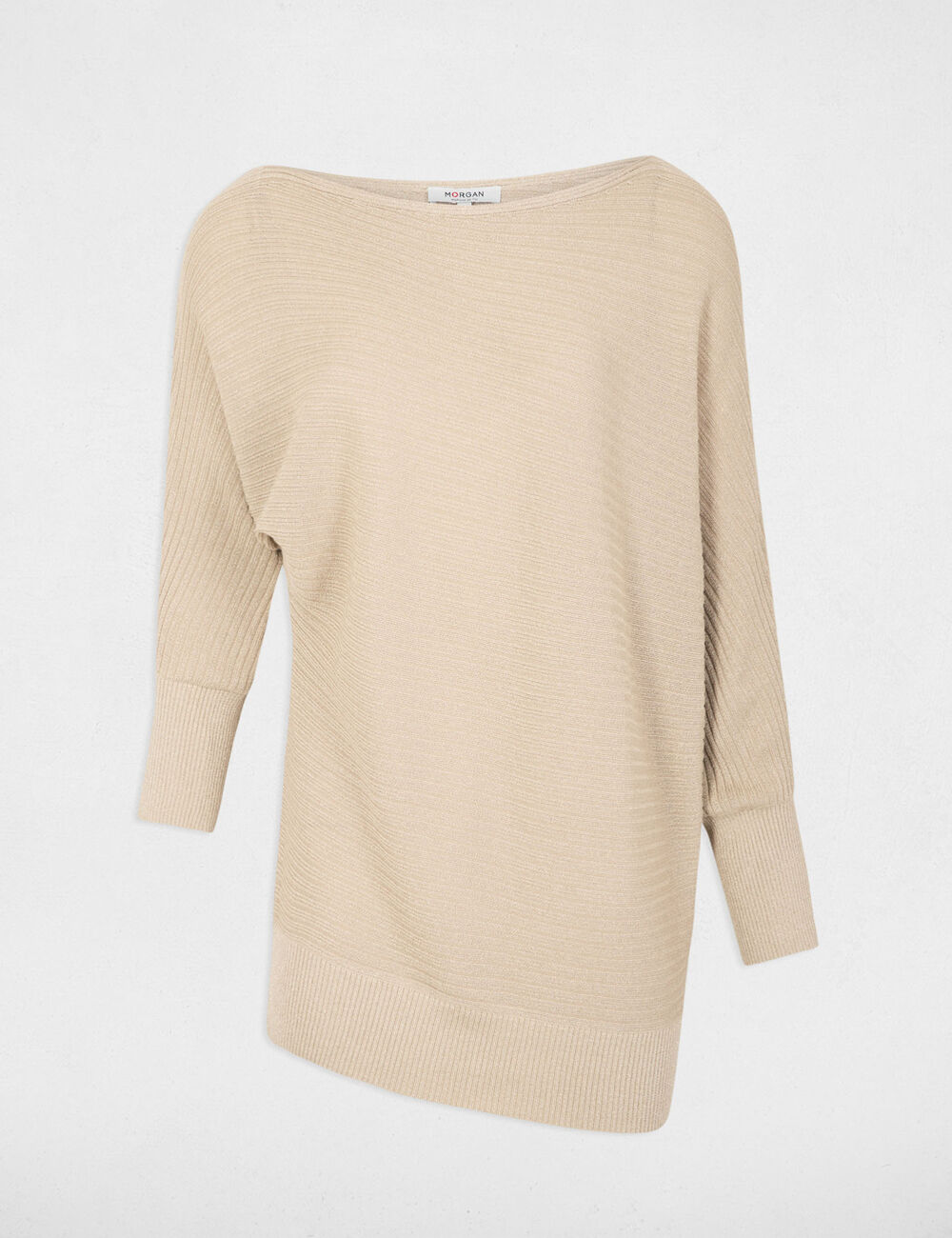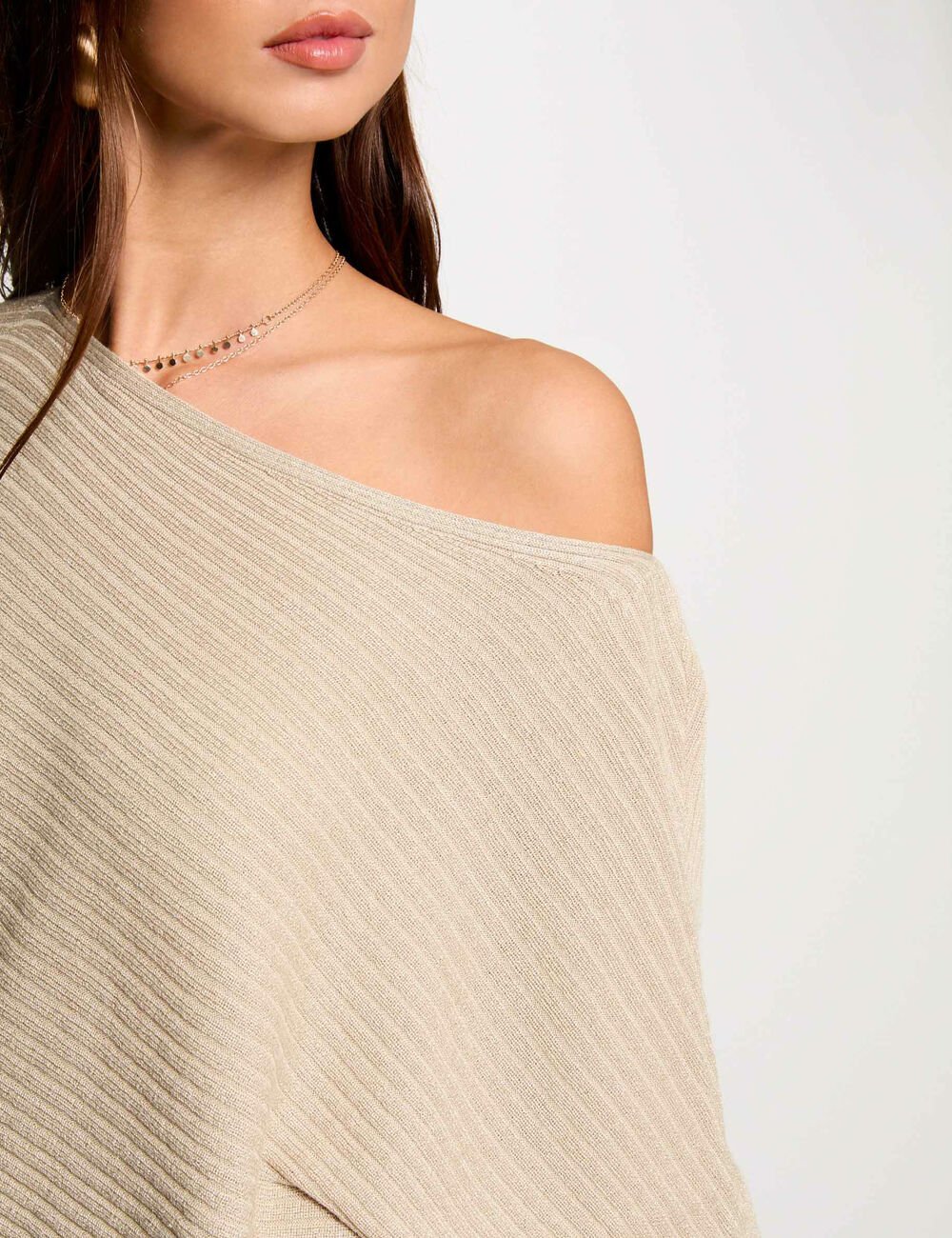 Camisola de malha fina, com decote assimétrico, estilo barco, e corte direito. Mangas dolman. Fio metalizado na malha.