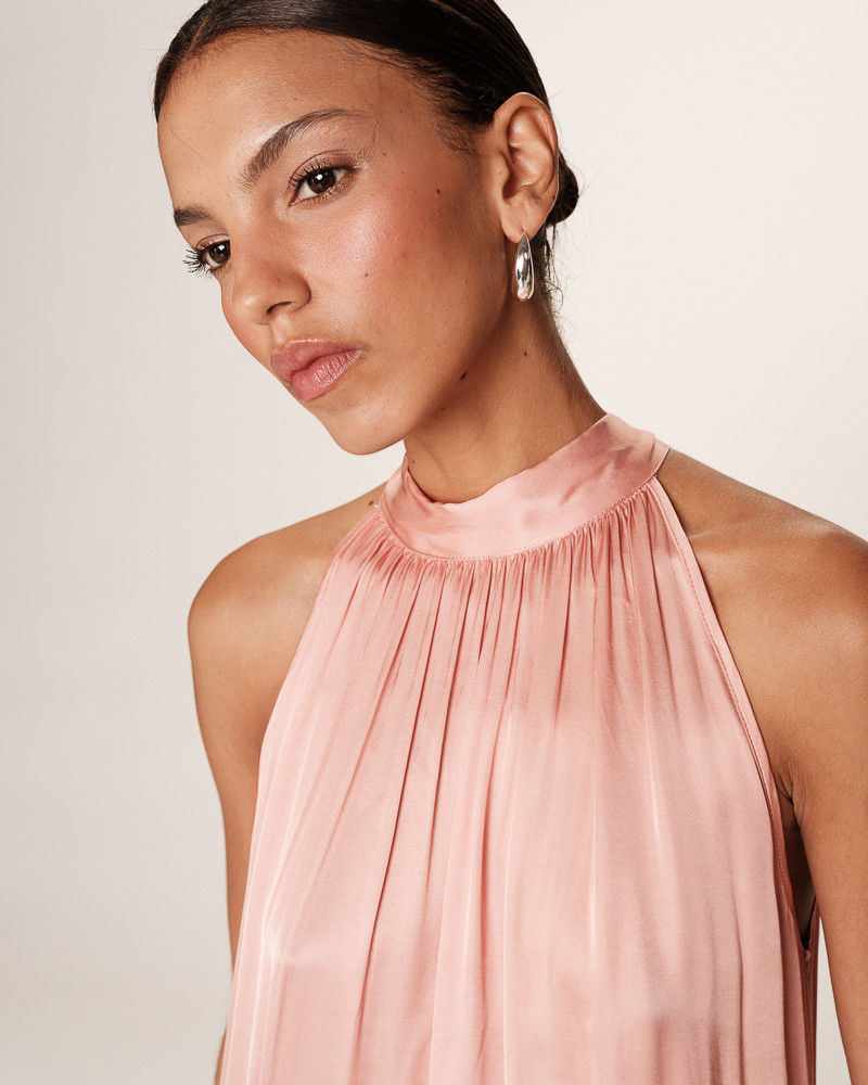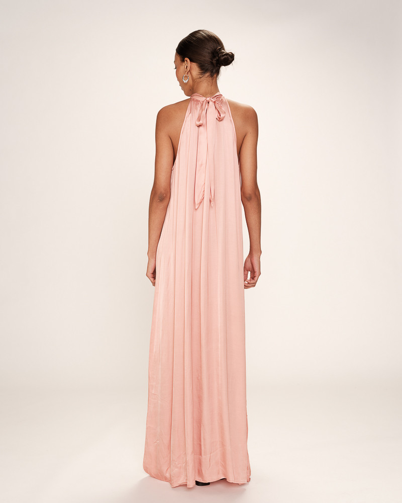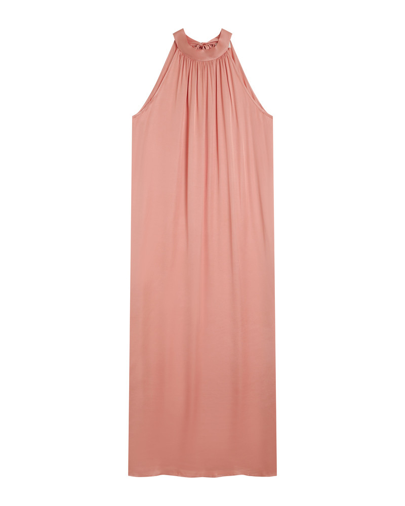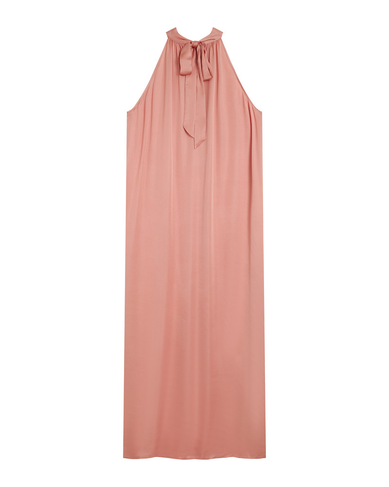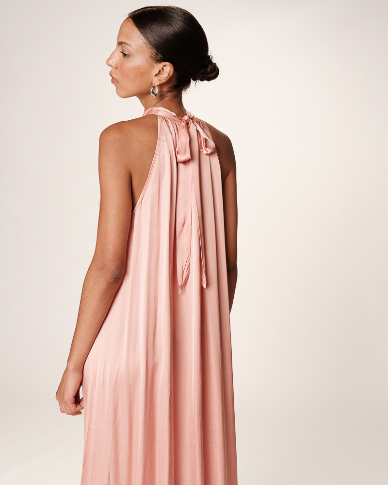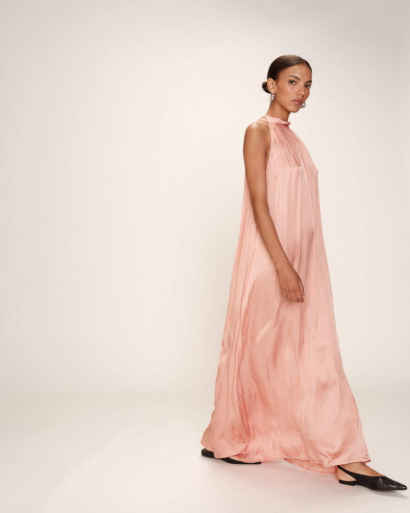O cetim é convidado a entrar no guarda-roupa da coleção e adorna o vestido longo ROSE , oferecendo um visual feminino e refinado. O decote alto do vestido de cetim ROSE , valorizado por franzidos e laço para amarrar nas costas, confere ao modelo um toque de sofisticação e elegância. O tecido fluido abraça as curvas femininas e cria uma silhueta leve e arejada. Feito de fibras naturais, o vestido se junta à nossa linha de fibras naturais 'Un Brin de Vert'.