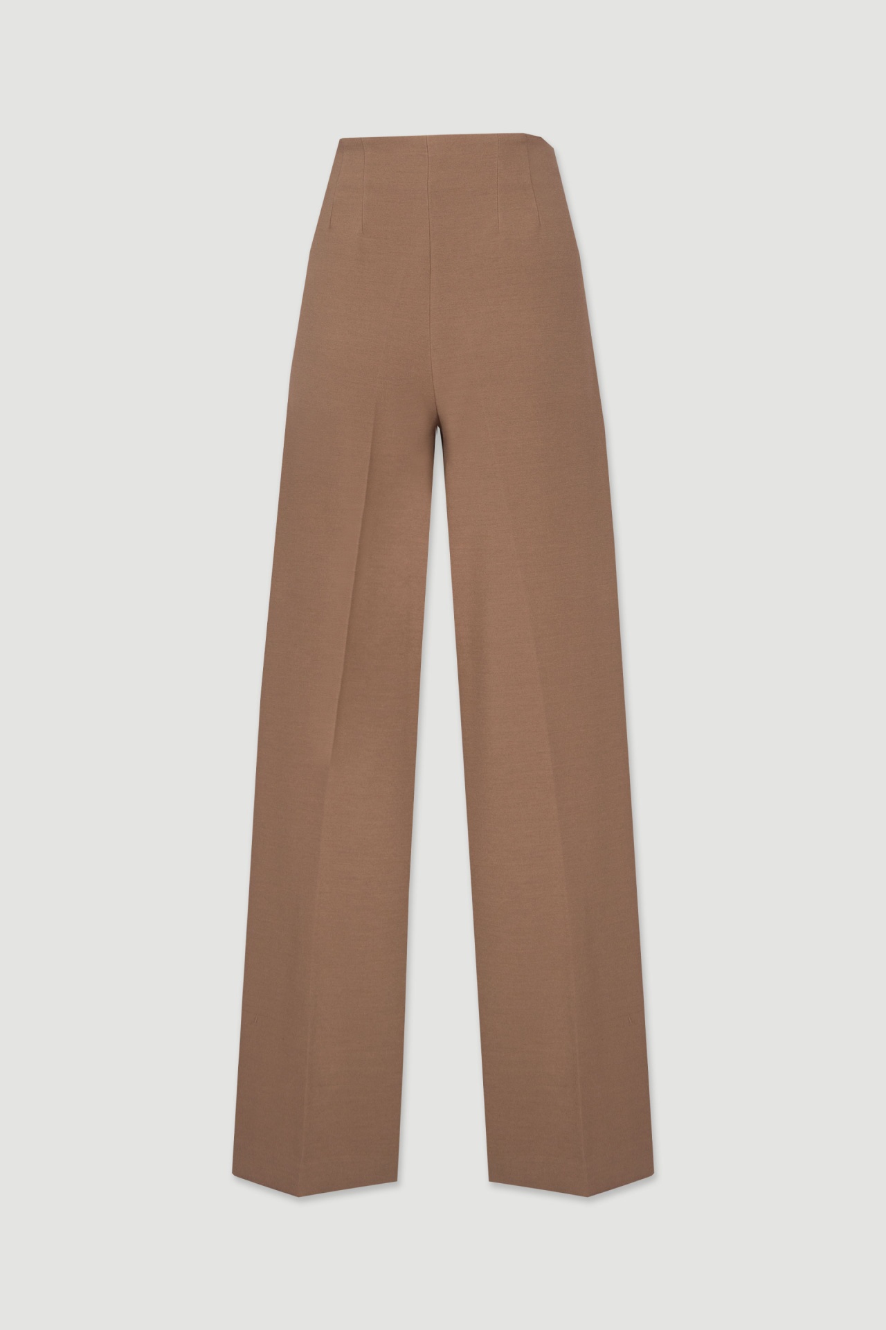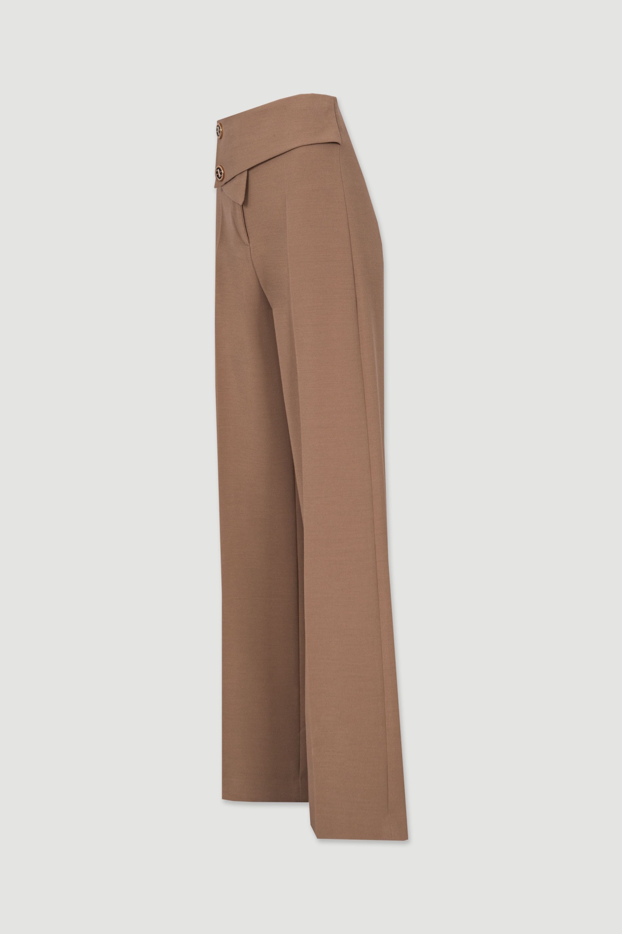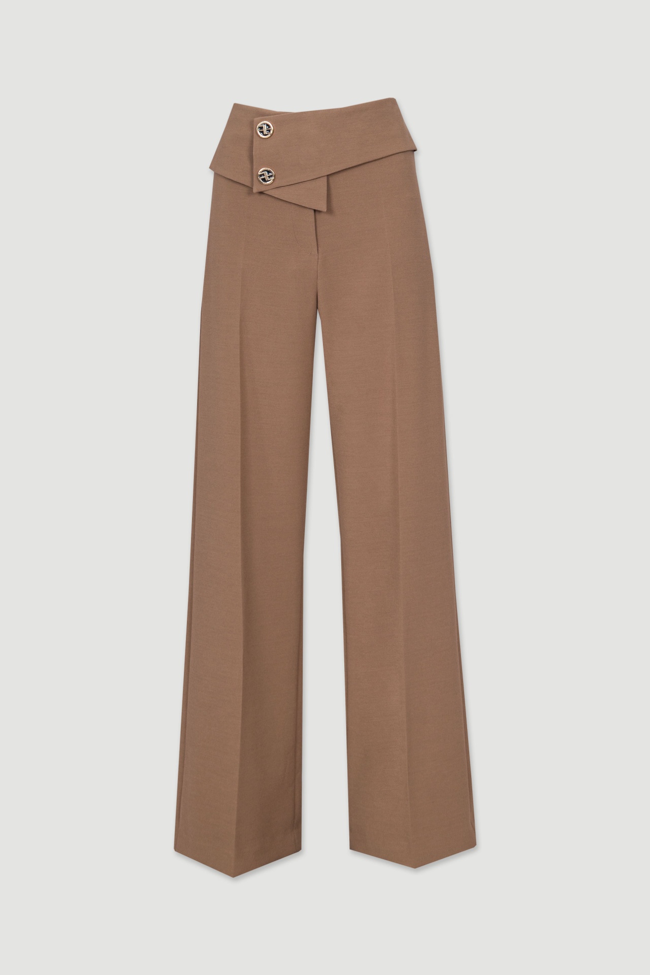 Calça clássica wide leg de cintura subida. Tecido sobreposto frontal com fecho em botão de pressão personalizado. Fecho de correr e botão interior. Aguenta tamanho abaixo do habitual face à elasticidade do tecido.