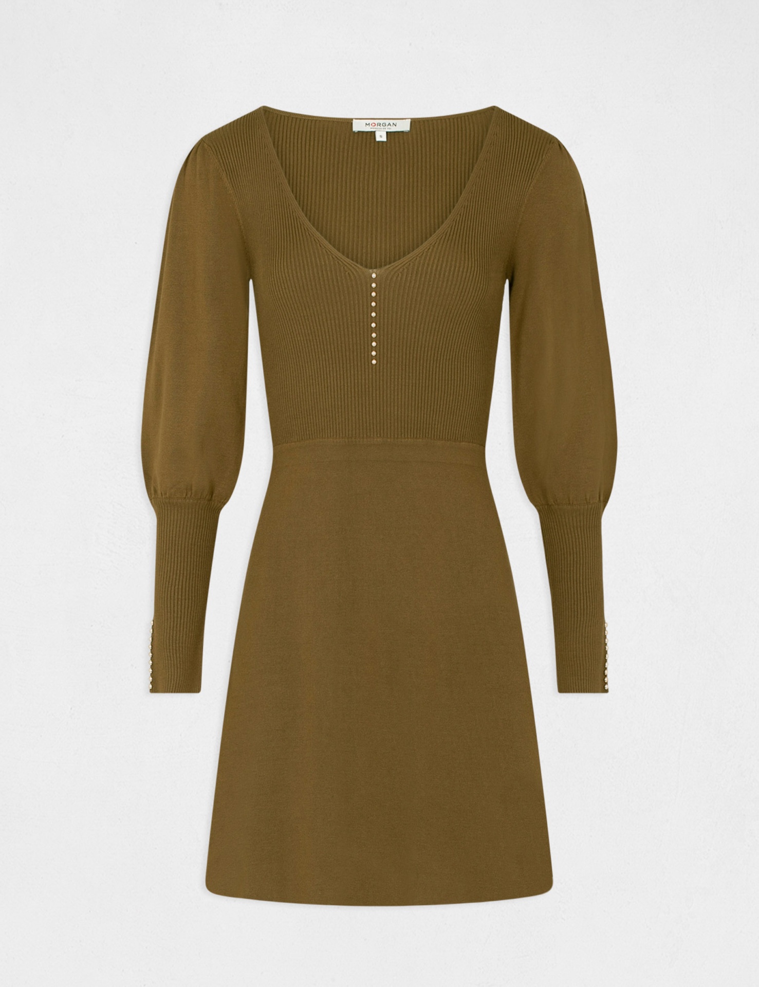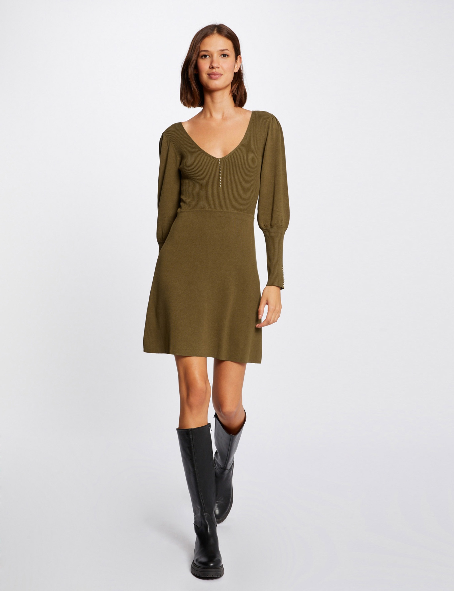 O vestido SAPIN em malha fina canelada apresenta silhueta feminina com saia em A e mangas em balão que equilibram romantismo e modernidade.
