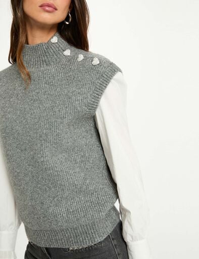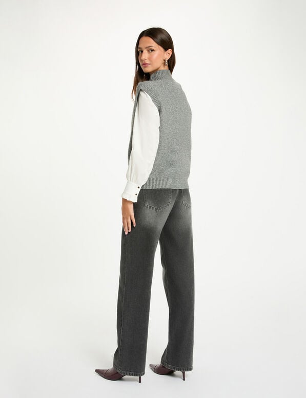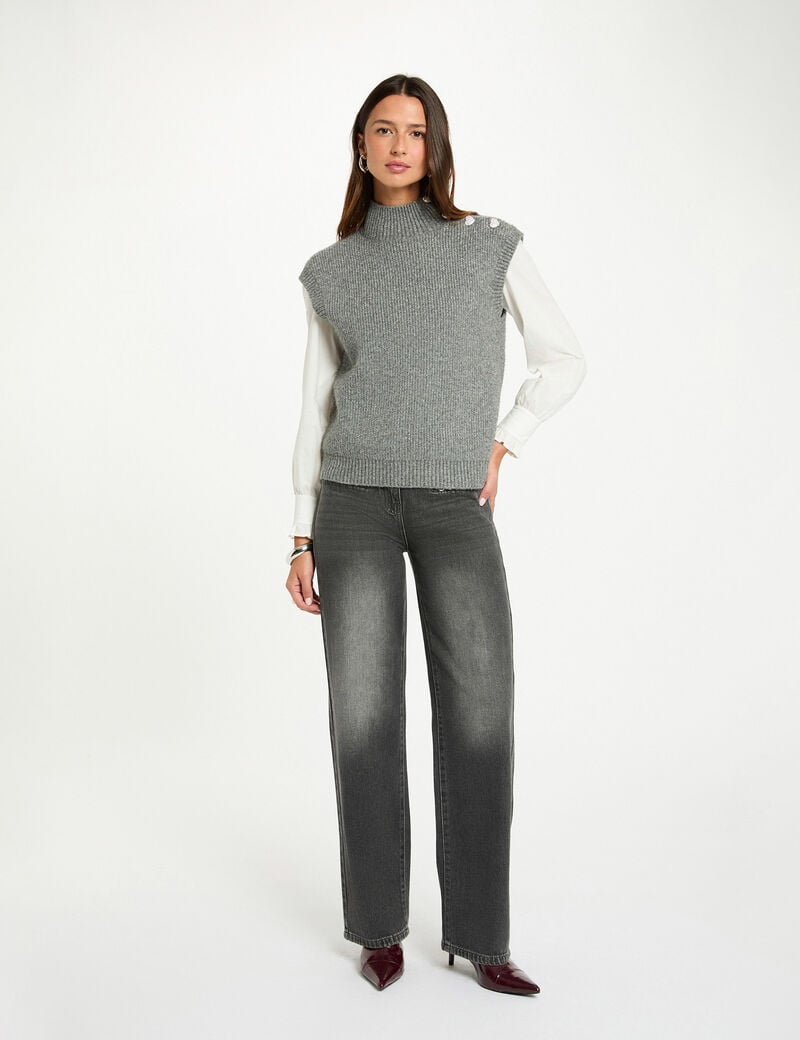 Um colete em malha, que combina modernidade e elegância com a sua gola alta, que alonga a silhueta e valoriza o decote. Os botões delicados conferem um toque sofisticado a esta peça casual, ideal para um estilo atemporal.