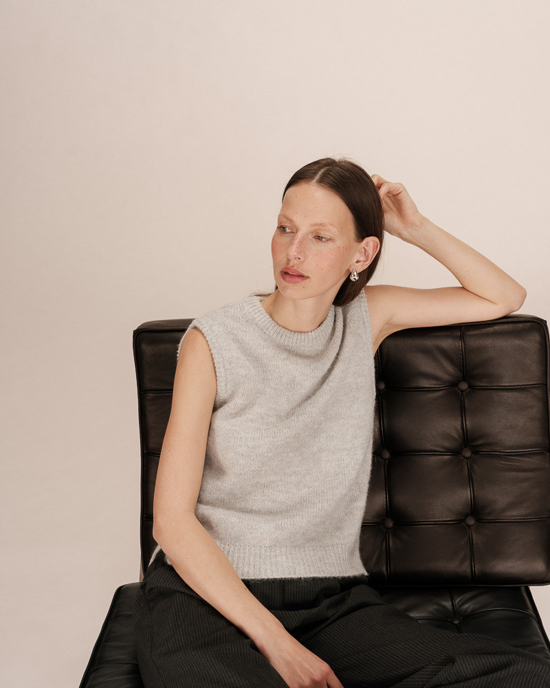 O suéter sem mangas SAY é confeccionado em uma mistura de poliéster reciclado, lã e alpaca. O corte reto e clean e o tricô jersey criam uma silhueta minimalista e moderna. O suéter sem mangas de lã SAY apresenta gola redonda e fendas laterais para um visual simples e elegante.