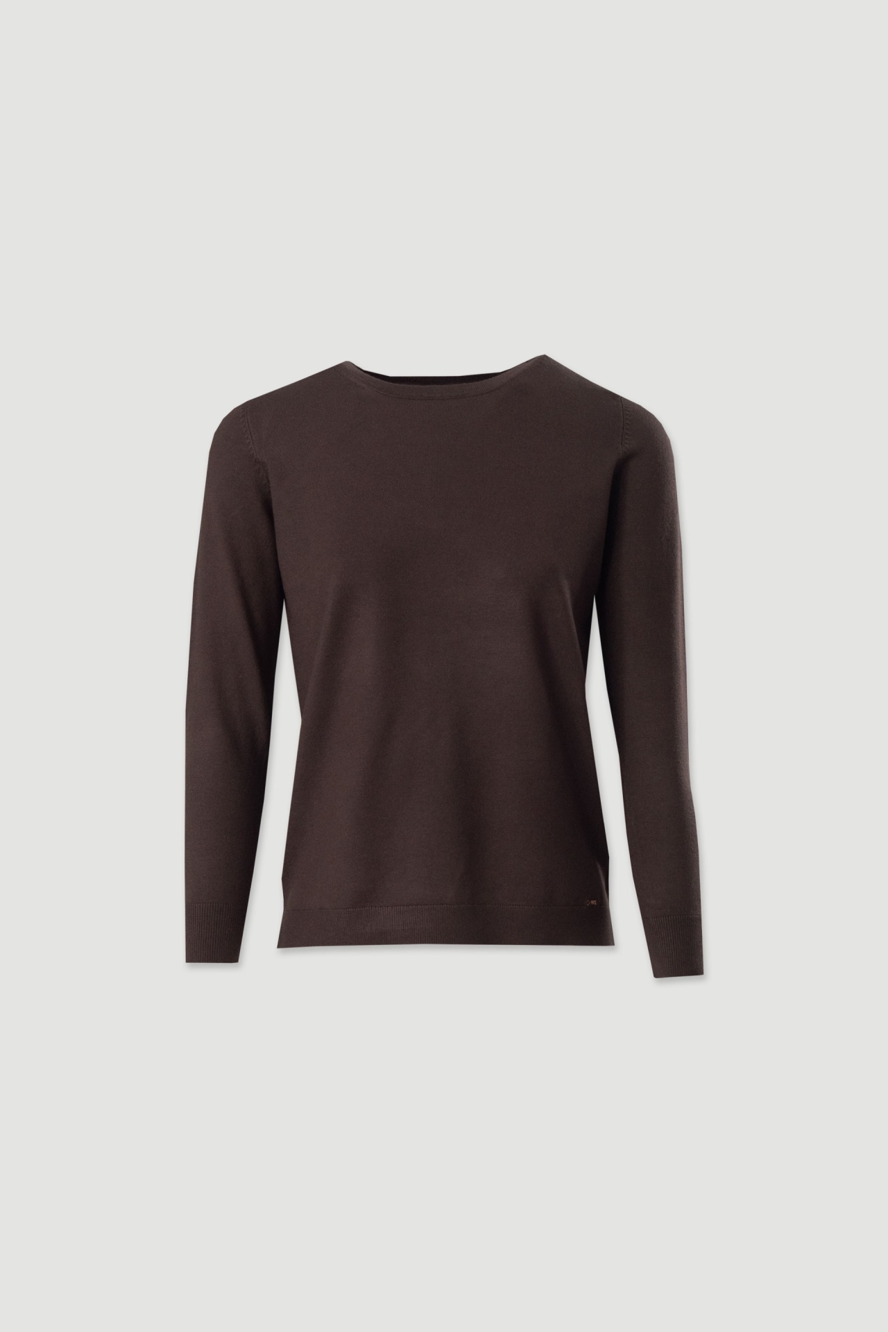 Camisola básica de malha, um essencial intemporal no guarda-roupa feminino. Com decote redondo e mangas compridas, garante conforto e versatilidade em qualquer estação. Os acabamentos canelados no decote, punhos e cós acrescentam estrutura e um toque clássico, tornando-a perfeita para coordenados casuais ou sofisticados.