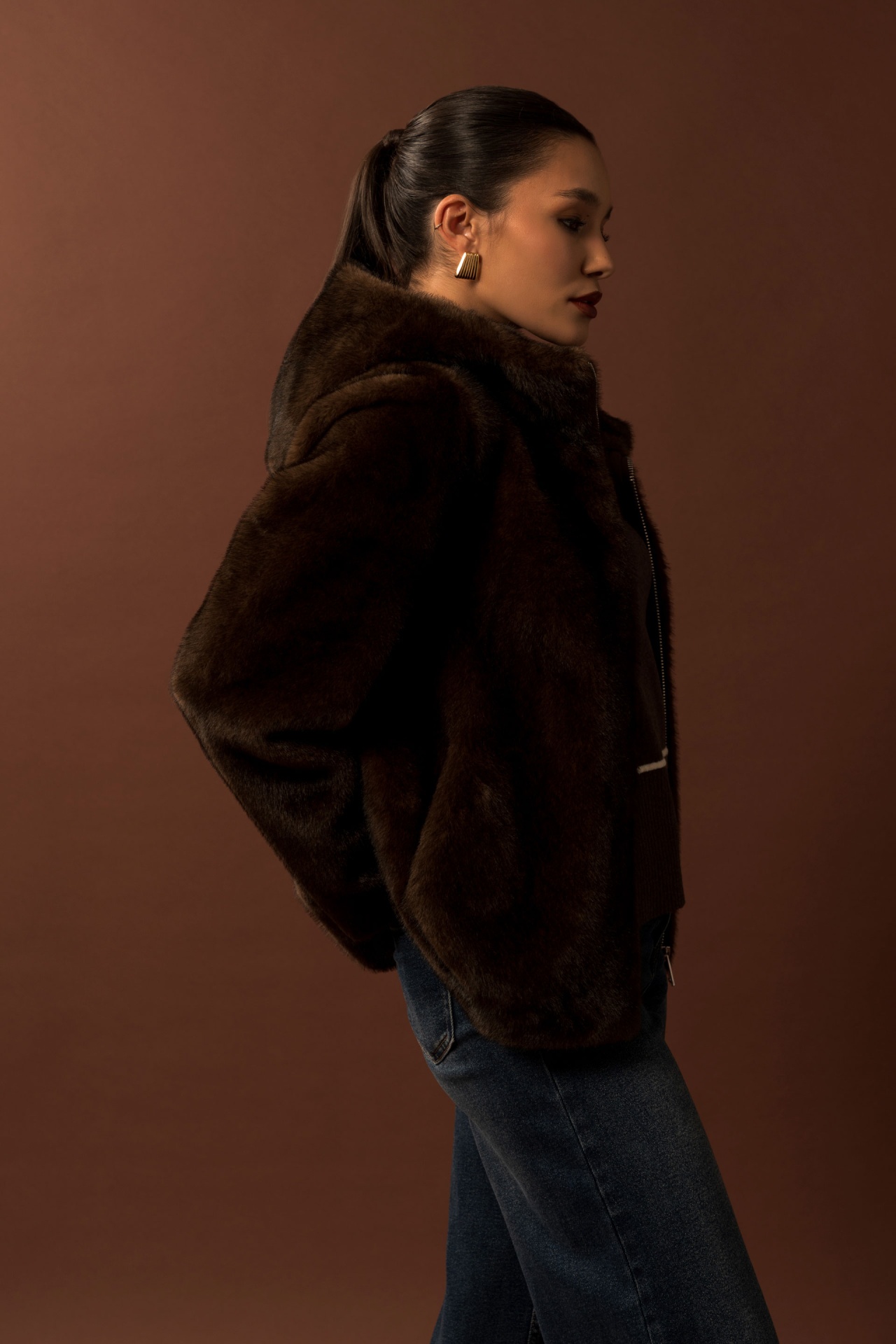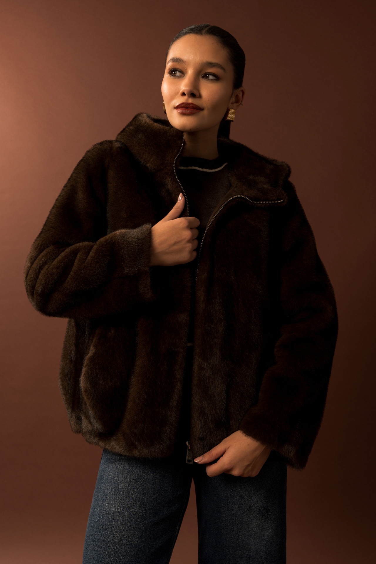 Casaco curto em pêlo sintético macio, com capuz e fecho frontal oculto, perfeito para os dias frios. De corte reto e textura envolvente, combina conforto e sofisticação num só design. Os bolsos laterais discretos acrescentam praticidade, tornando-o uma peça essencial para um look elegante e aconchegante. Ideal para coordenar com vestidos midi ou calças de alfaiataria.