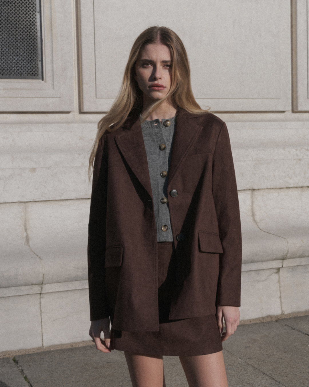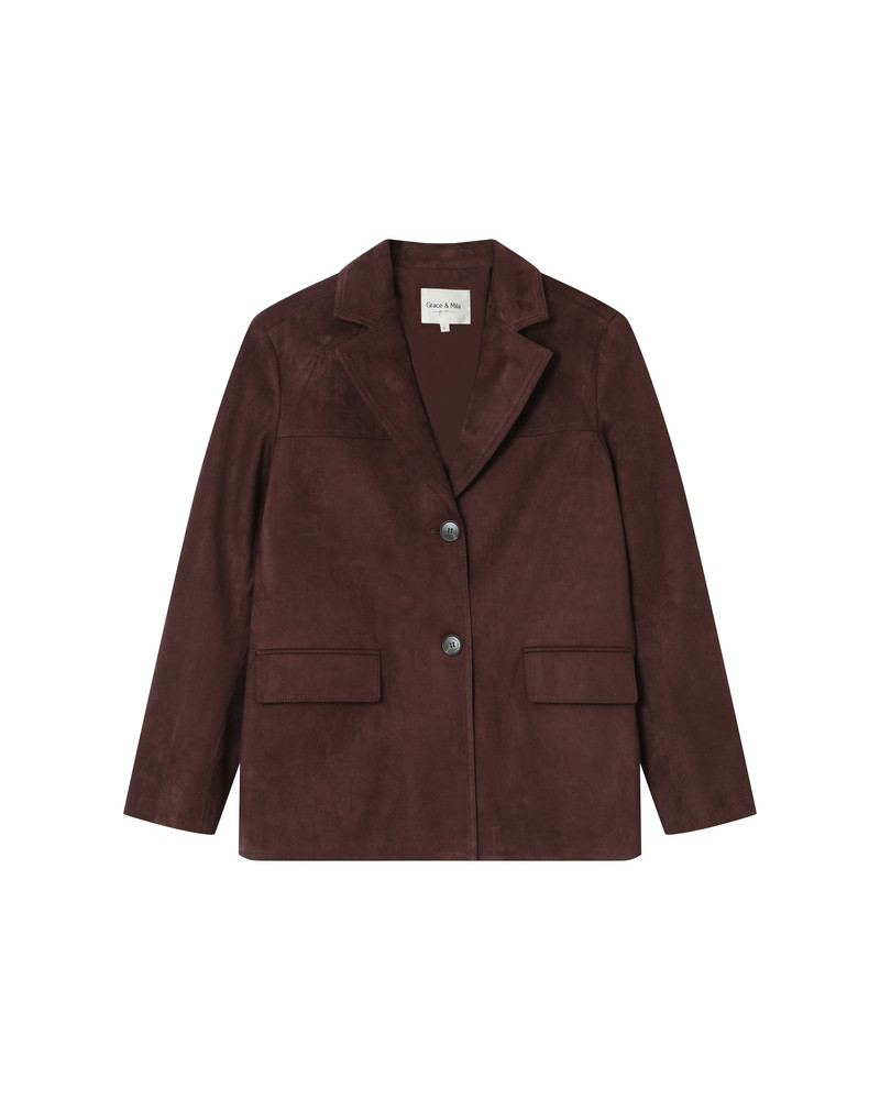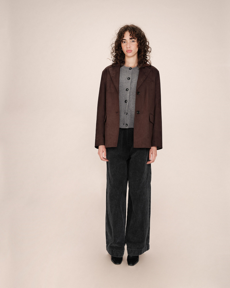 A jaqueta SHANNON de abotoamento simples inspira-se na alfaiataria clássica com um toque contemporâneo. O tecido de camurça e o corte reto criam uma silhueta estruturada e elegante. O modelo apresenta detalhes complexos, como gola de lapela, bolsos frontais com aba e carcela frontal com botões. A jaqueta SHANNON de manga comprida é um item essencial do guarda-roupa de inverno para um visual ousado e atemporal. A peça é forrada. Modelo oversized.