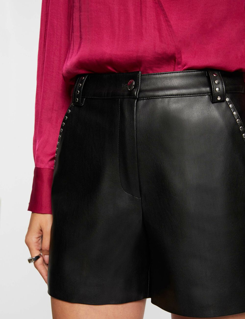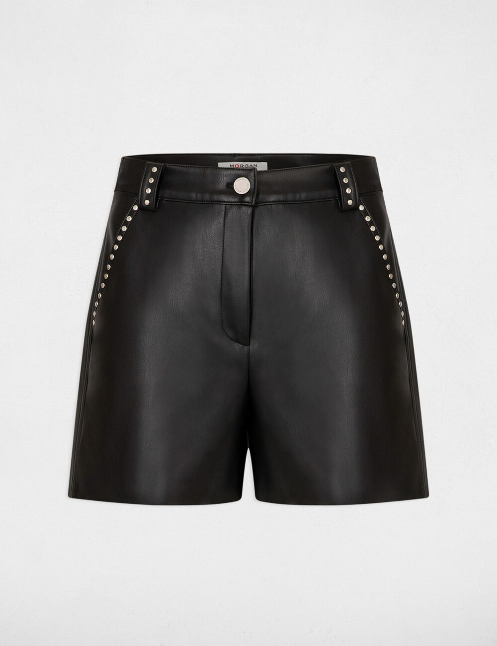 Calções em eco pele, com cintura subida, corte ajustado. Bolsos italianos na frente. Detalhes metálicos junto aos bolsos e cintura. Presilhas para cinto.