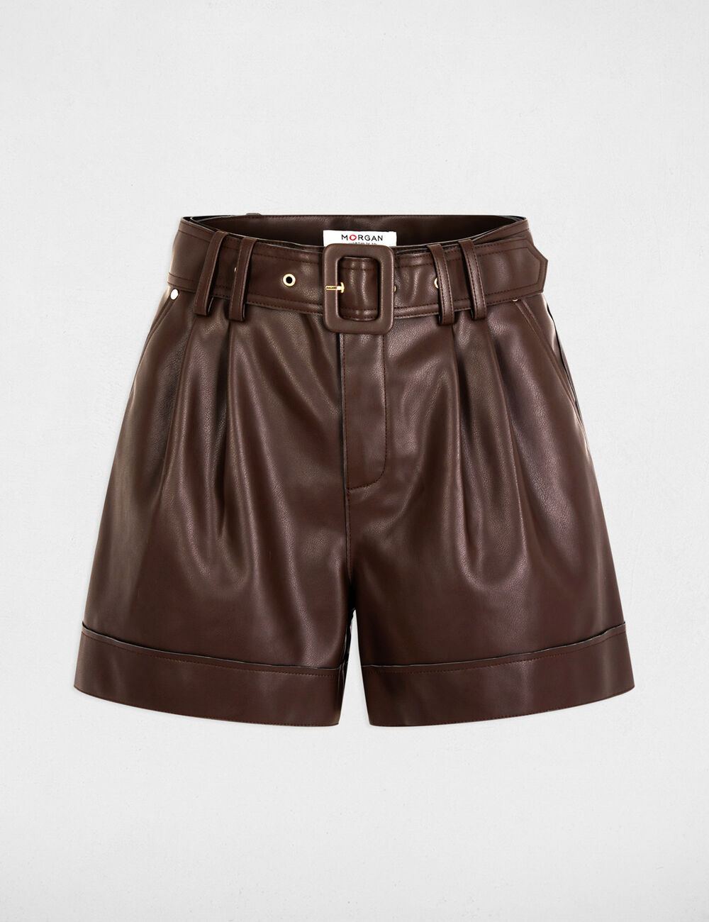 Calções em eco pele, com corte ajustado, cintura subida e pinças na cintura. Dois bolsos italianos na frente e dois bolsos patch atrás. Presilhas e cinto com fivela ajustável no mesmo tecido.
