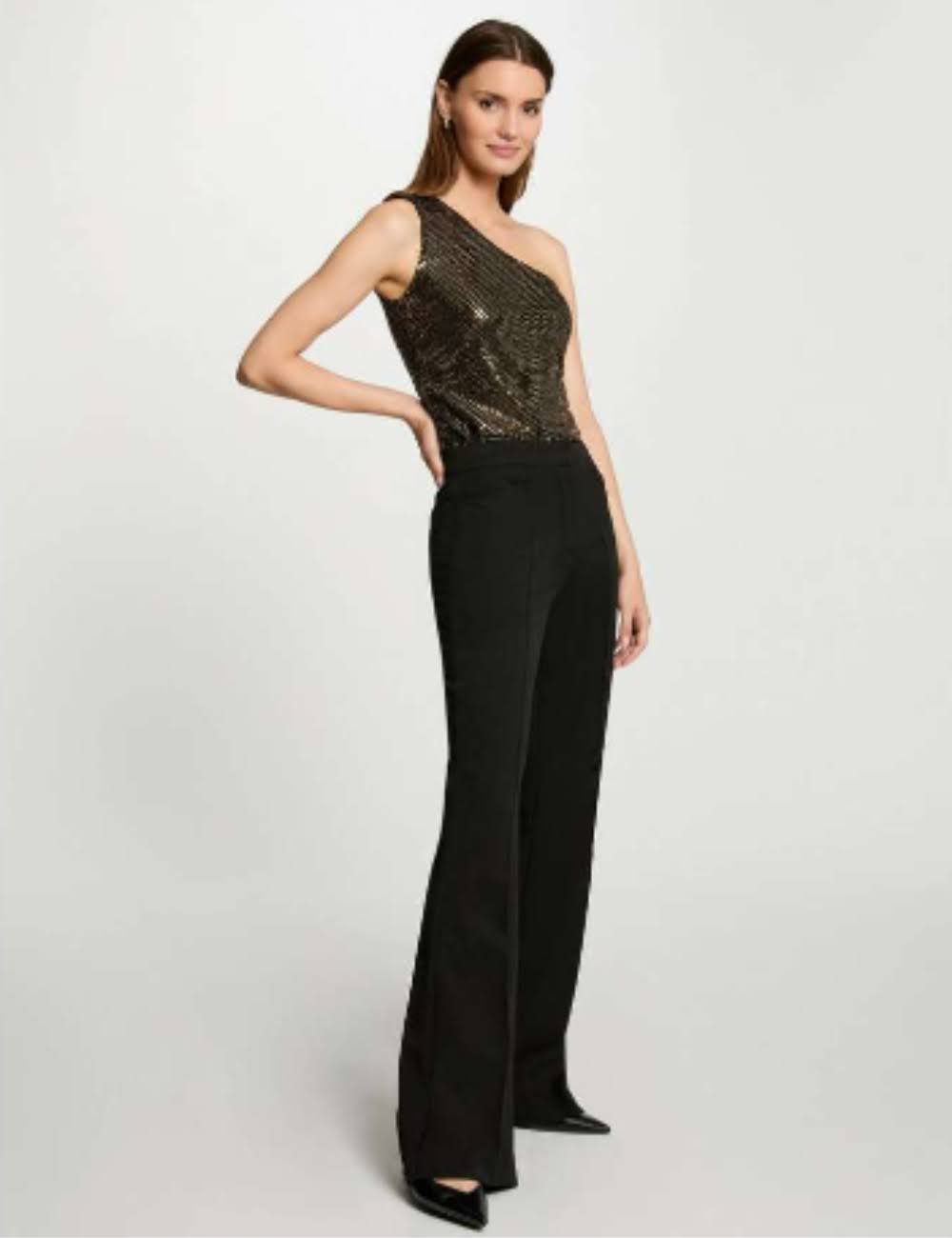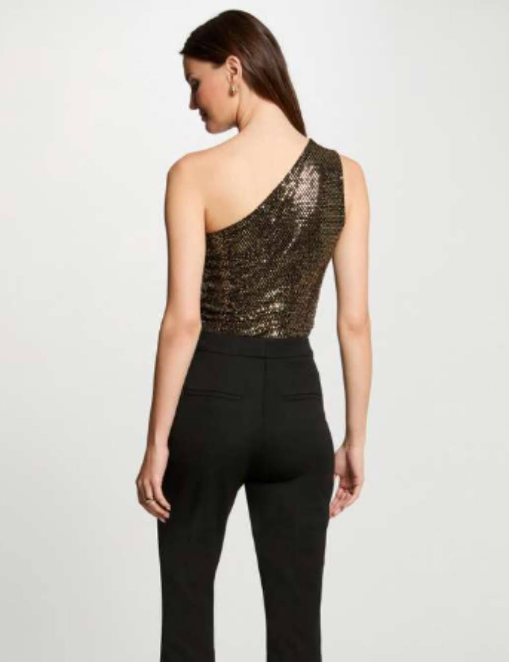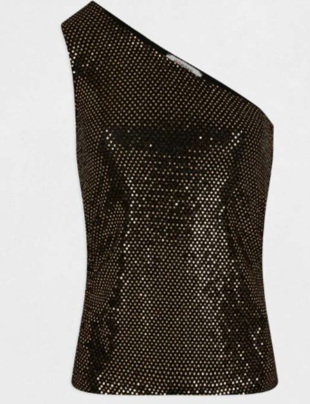 Top com corte justo e decote assimétrico. Fecho lateral. Efeito brilho com lantejoulas e fio metalizado.