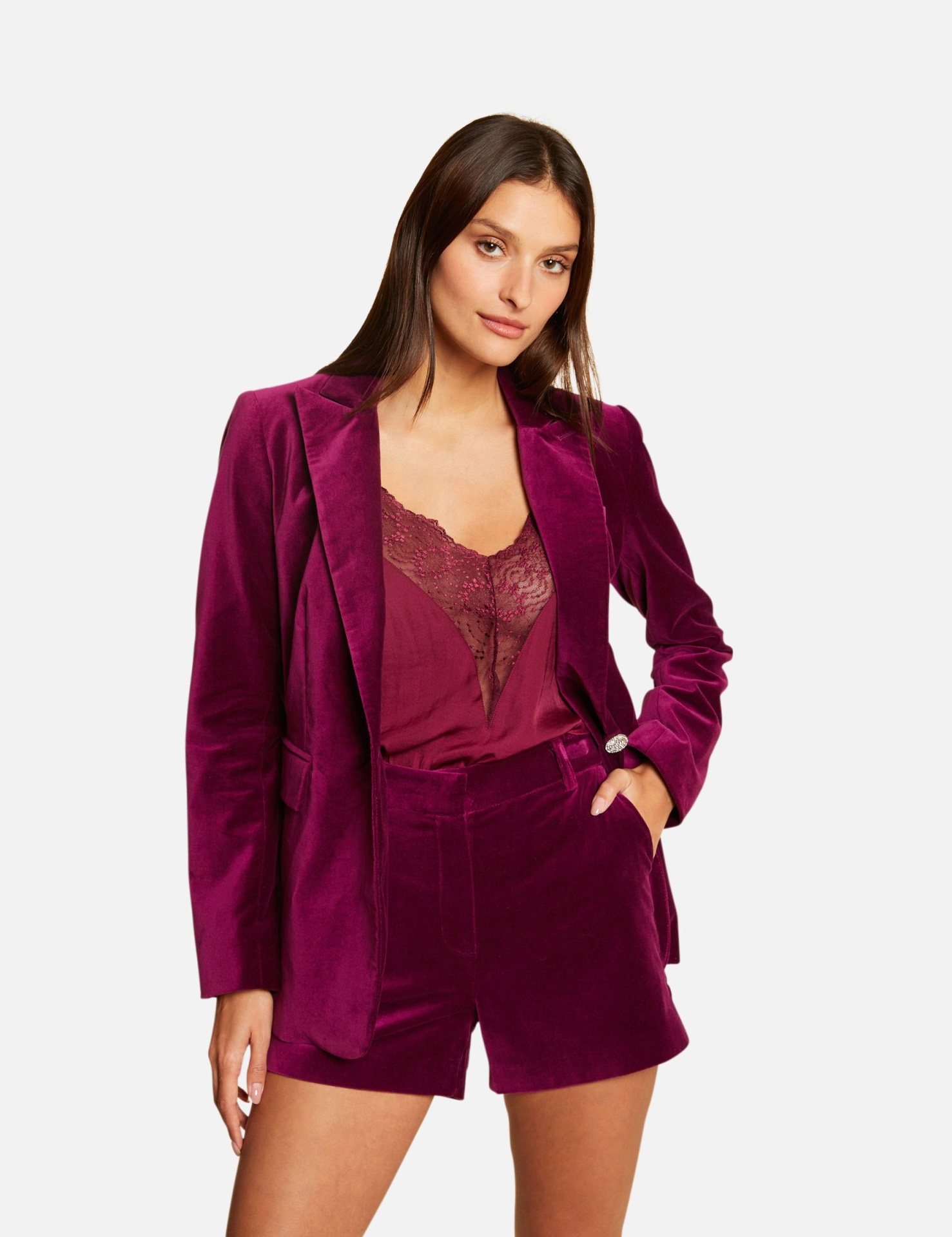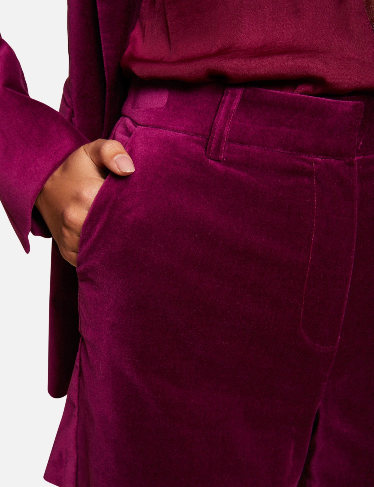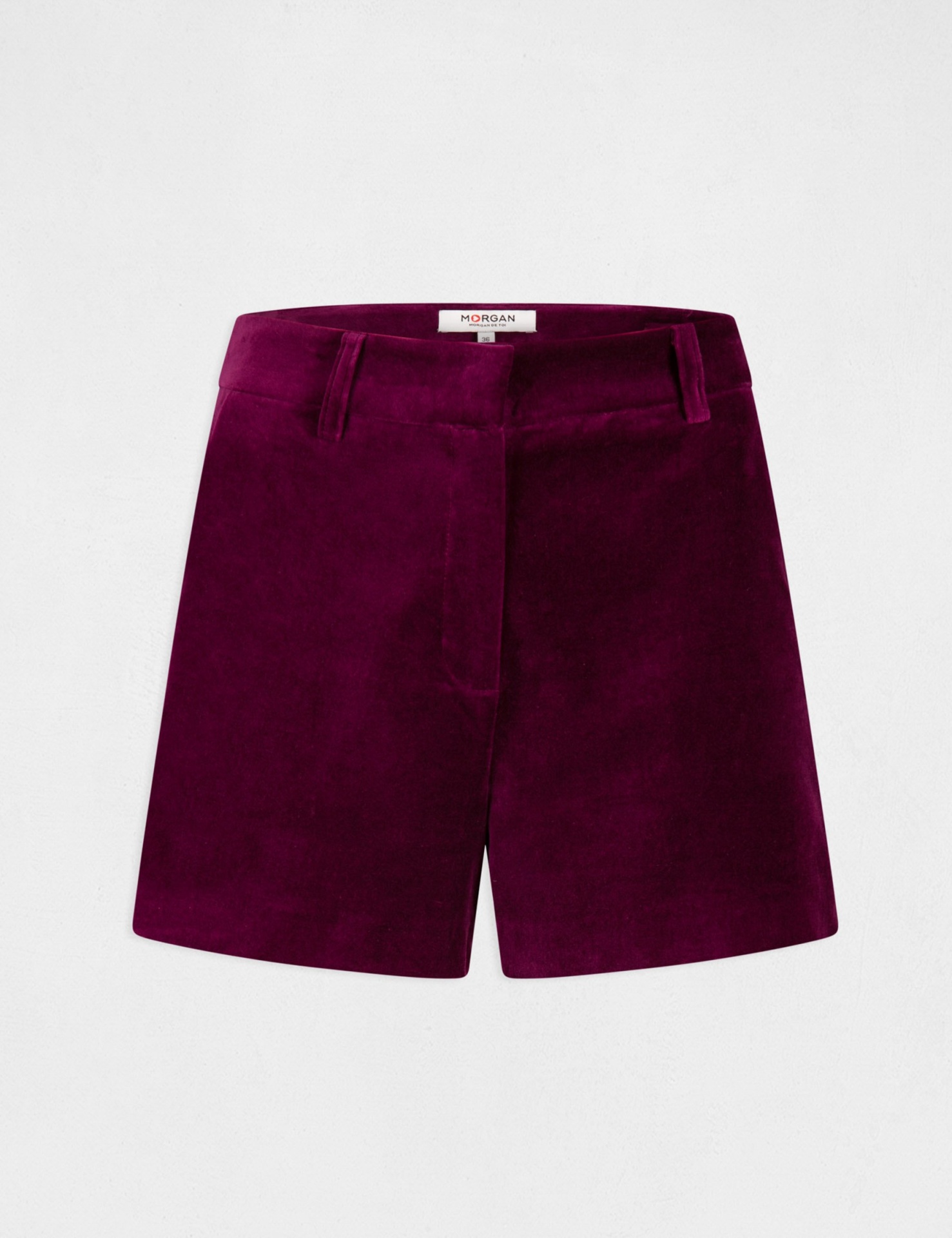 Calções de veludo, com cintura média e corte direito. Fecho e botão na frente. Dois bolsos italianos na frente. Presilhas no mesmo tecido.