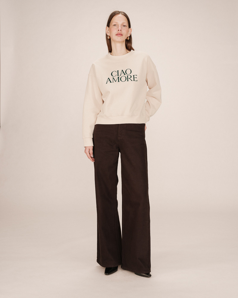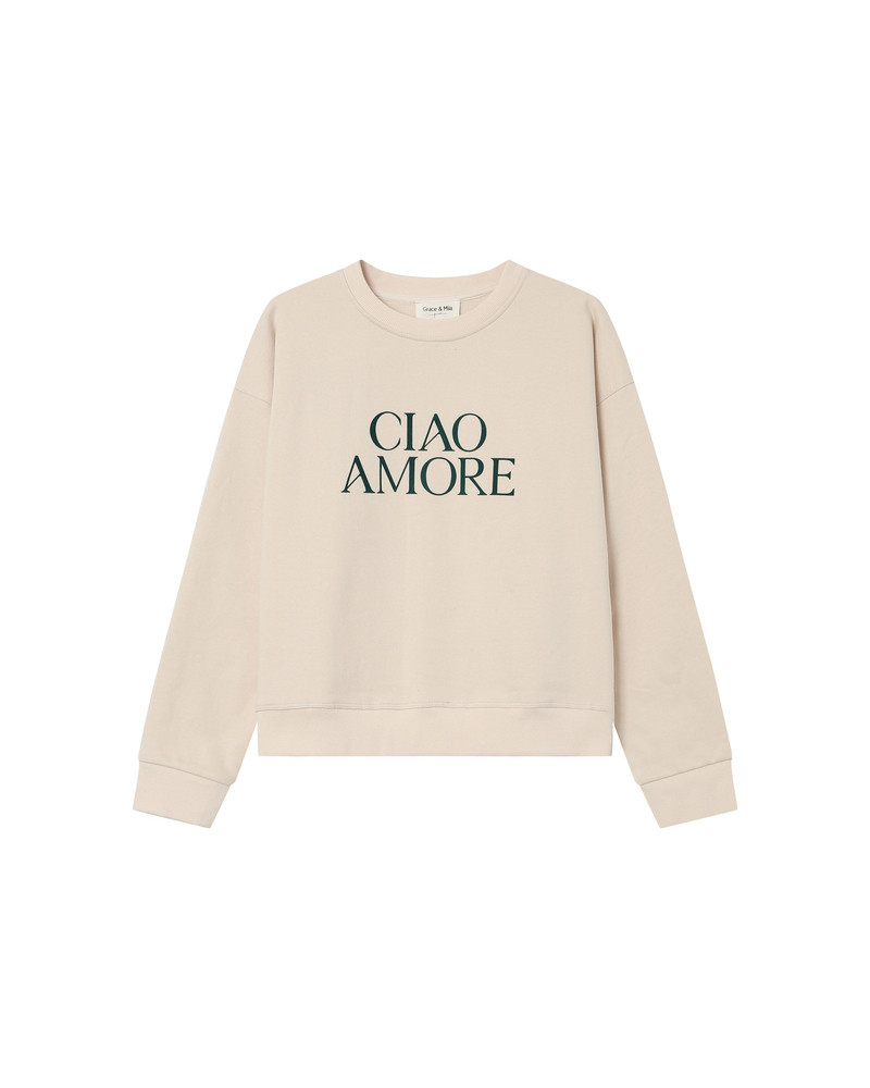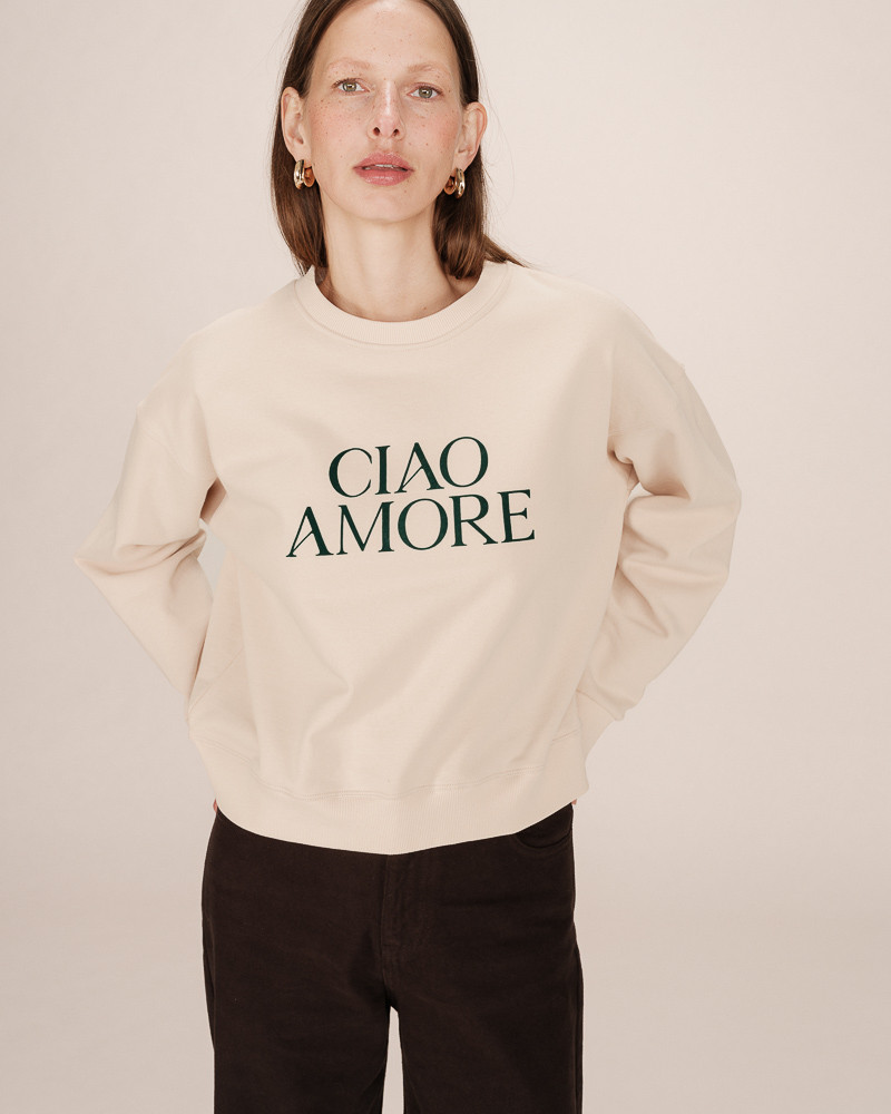 O moletom SIGIL apresenta uma estampa de veludo com a inscrição "Ciao Amore" na frente. Seu caimento solto, mangas compridas e ombros caídos criam um visual descontraído. O moletom SIGIL apresenta punhos, gola e cós canelados, que estruturam a silhueta.