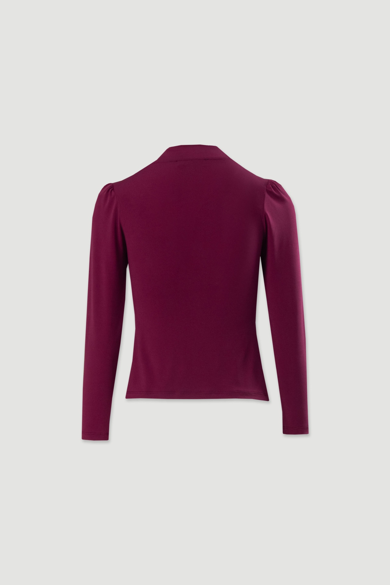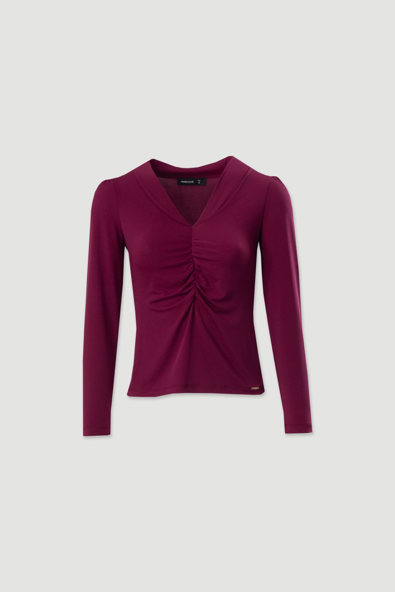 Camisola de malha de manga comprida, com design feminino e sofisticado. Apresenta decote em V cruzado com gola larga, que alonga a silhueta com elegância. O franzido frontal acrescenta textura e um detalhe moderno, enquanto os ombros almofadados conferem estrutura e um toque distinto ao visual.